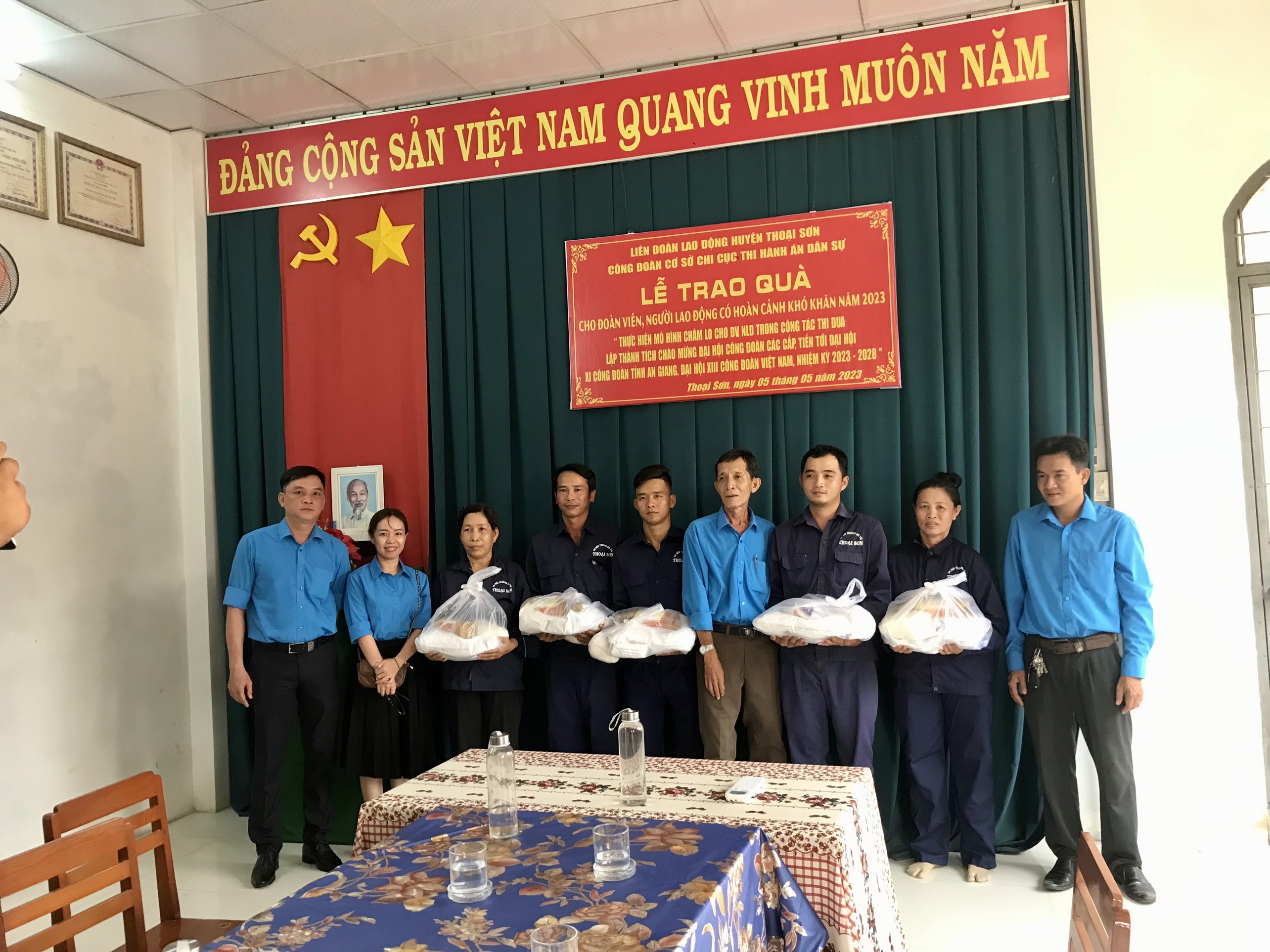 Hưởng ứng Tháng công nhân năm 2023 của Liên đoàn lao động huyện Thoại Sơn, chiều ngày 5/5, Ban Chấp hành CĐCS Chi cục Thi hành án dân sự Thoại Sơn đến thăm và tặng 30 suất quà cho đoàn viên CĐCS Xí nghiệp Môi trường đô thị Thoại Sơn với tổng số tiền là 4.500.000 đồng từ nguồn quỹ vận động. Tại buổi trao quà, đồng chí Nguyễn Văn Buôn - Chủ tịch CĐCS Chi cục Thi hành án dân sự đã ân cần hỏi thăm, động viên các công nhân vượt qua khó khăn, đoàn kết thống nhất hoàn thành tốt nhiệm vụ được giao.