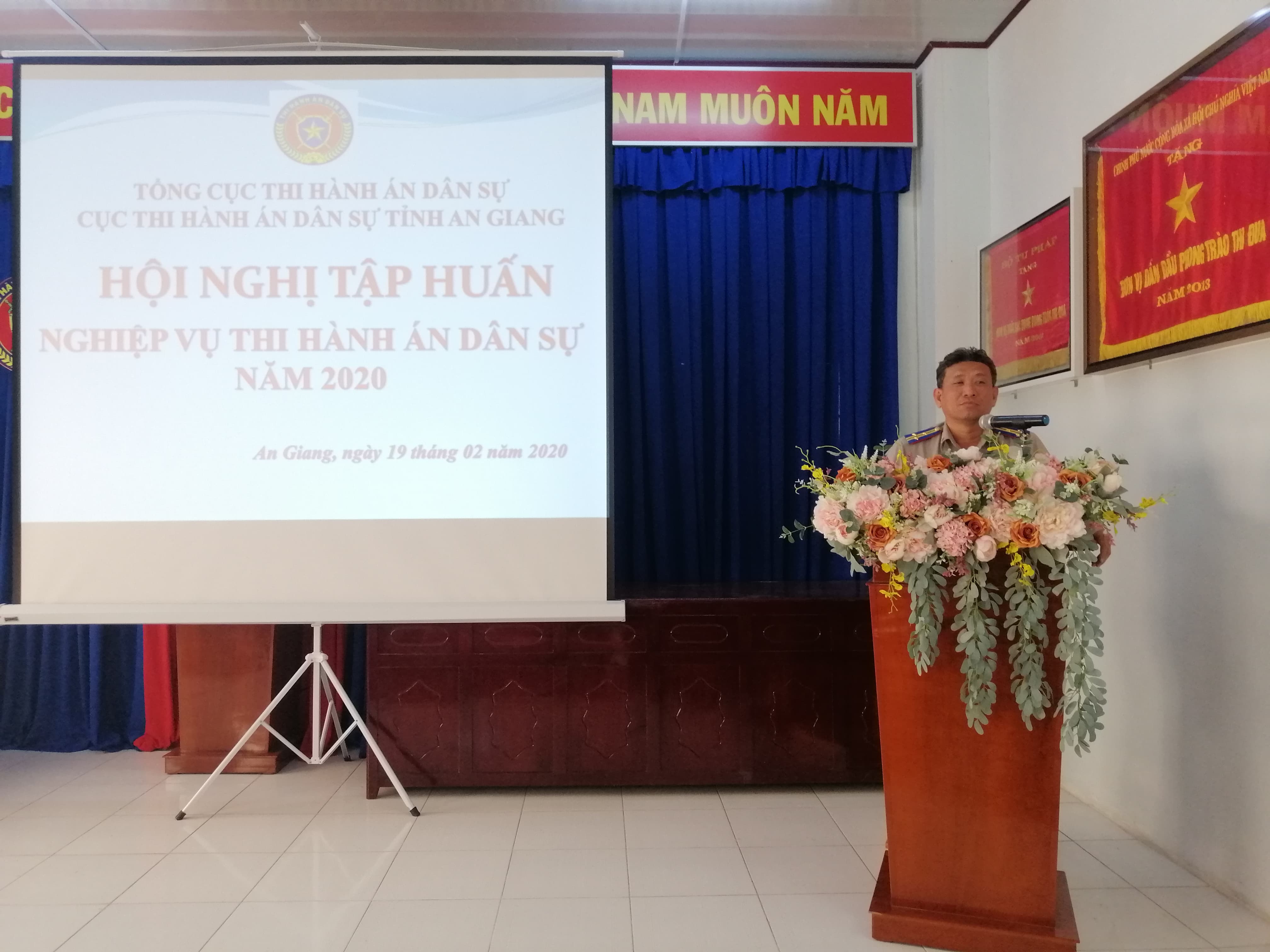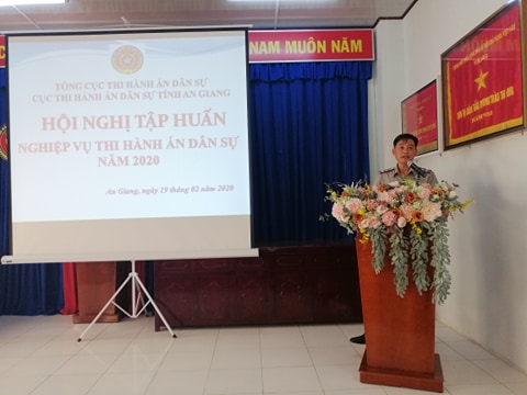 Thực hiện Kế hoạch công tác năm 2020 của Cục Thi hành án dân sự tỉnh An Giang đã được Tổng cục Thi hành án dân sự - Bộ Tư pháp phê duyệt; nhằm nâng cao trình độ chuyên môn, kỹ năng nghiệp vụ trong công tác thi hành án dân sự, kịp thời hướng dẫn chỉ đạo nghiệp vụ, tháo gỡ vướng mắc, khó khăn trong công tác thi hành án dân sự, quán triệt và cập nhật kịp thời những nội dung các văn bản mới ban hành. Ngày 19/02/2020, Cục Thi hành án dân sự tỉnh An Giang tổ chức Hội nghị tập huấn nghiệp vụ thi hành án dân sự cho toàn thể Chấp hành viên, Thẩm tra viên, Thư ký, kế toán nghiệp vụ, thủ kho, thủ quỹ Cục THADS và các Chi cục THADS trực thuộc trên địa bàn tỉnh.