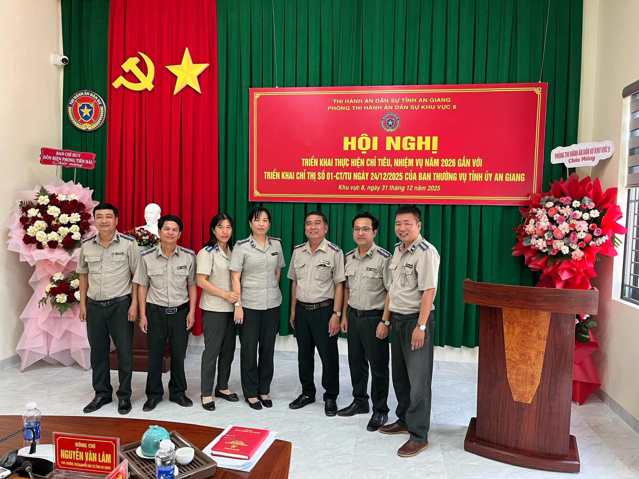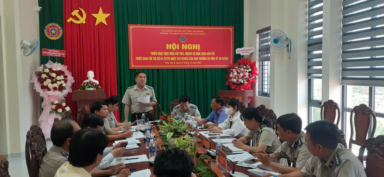 Chiều ngày 31/12/2025, Phòng Thi hành án dân sự (THADS) khu vực 8, tỉnh An Giang tổ chức Hội nghị triển khai thực hiện chỉ tiêu, nhiệm vụ năm 2026 gắn với triển khai Chỉ thị số 01-CT/TU ngày 24/12/2025 của Ban Thường vụ Tỉnh uỷ tại Hội trường Phòng Thi hành án dân sự Khu vực 8.
