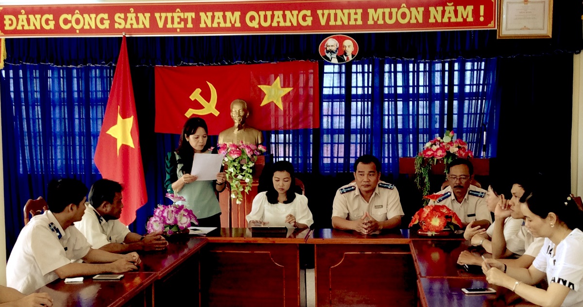 Đồng chí Huỳnh Thị Kim Dung Trưởng Phòng Tổ chức cán bộ công bố Quyết định của Cục trưởng Cục Thi hành án dân sự tỉnh Cà Mau về việc bổ nhiệm Phó Chi cục trưởng đối với đồng chí Võ Chí Đoán - Chấp hành viên sơ cấp Chi cục Thi hành án dân sự huyện Trần Văn Thời.
