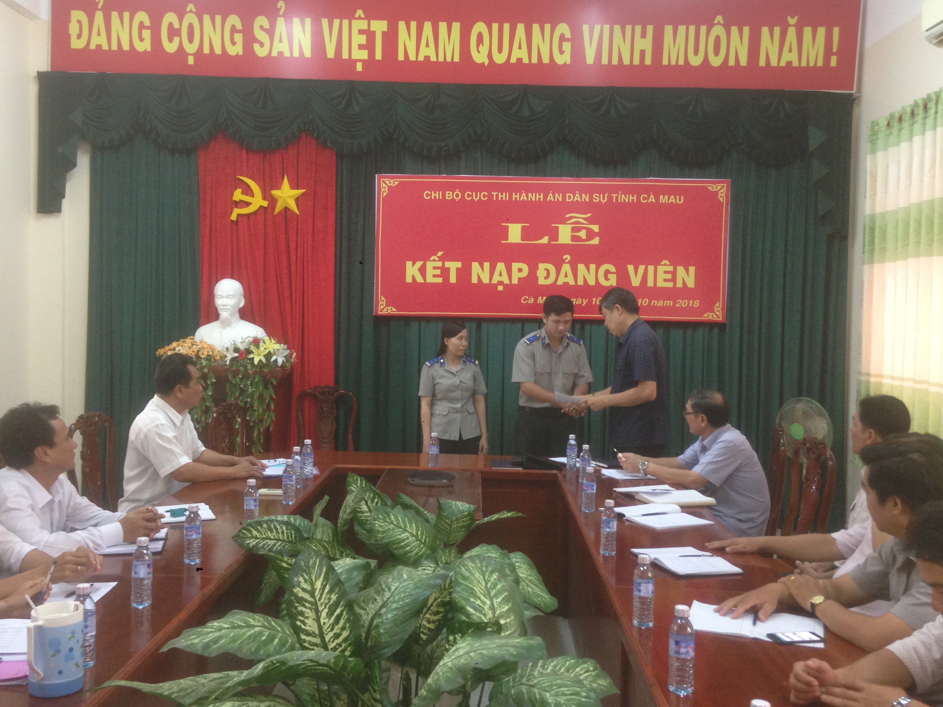 Chiều ngày 10/10/2018, Chi bộ Cục Thi hành án dân sự tỉnh Cà Mau tổ chức Lễ Kết nạp Đảng cho 02 quần chúng ưu tú là Đ/c Nguyễn Thị Phúc Trường - Chuyên viên Phòng TCCB và Đ/c Nguyễn Tín Đức - đoàn viên ưu tú. Tham dự buổi lễ có đồng chí Huỳnh Văn Hiệu - Bí thư Chi bộ Cục THADS tỉnh Cà Mau, Đ/c Huỳnh Hoàng Khâm - Phó Bí thư Chi bộ Cục THADS và cùng toàn thể đảng viên thuộc Chi bộ Cục THADS tỉnh Cà Mau.