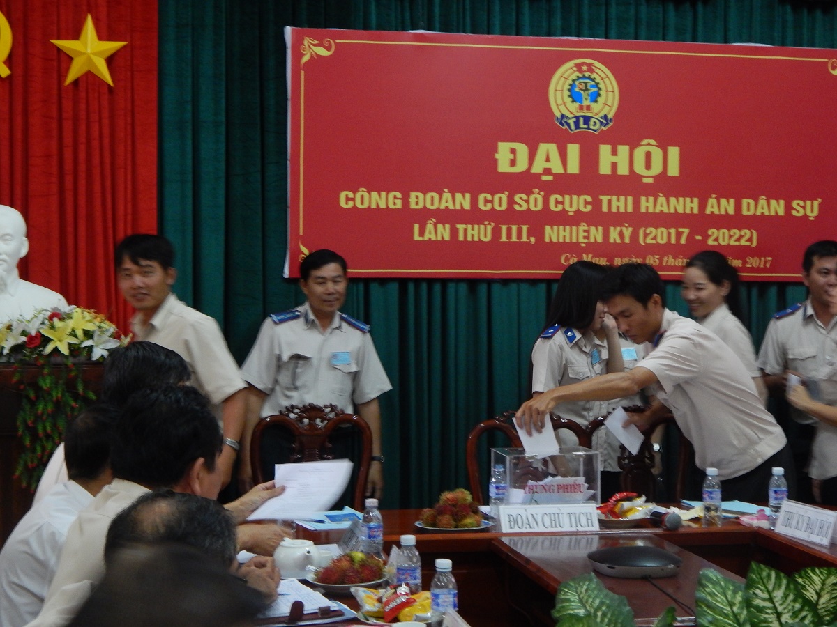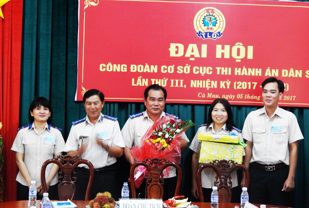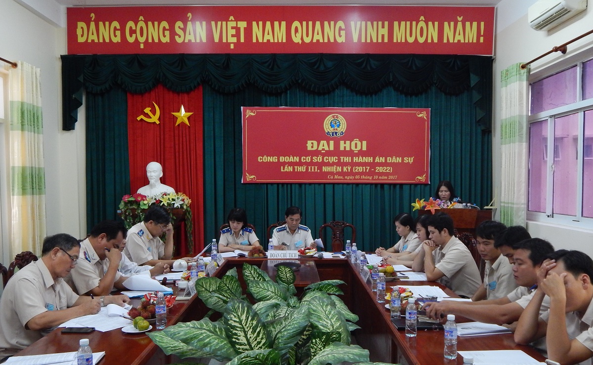Được sự thống nhất của Chi bộ, Lãnh đạo cơ quan và Liên đoàn Lao động tỉnh Cà Mau về việc tổ chức Đại hội Công đoàn cơ sở . Chiều ngày 05/10/2017 Công đoàn cơ sở Cục Thi hành án dân sự tỉnh Cà Mau tổ chức Đại hội nhiệm kỳ 2017-2022, nhằm kiểm điểm đánh giá việc thực hiện Nghị quyết Đại hội nhiệm kỳ 2012-2017, đề ra phương hướng, mục tiêu, nhiệm vụ công tác công đoàn và bầu Ban Chấp hành nhiệm kỳ 2017-2022, bầu đại biểu dự Đại hội công đoàn cấp trên.