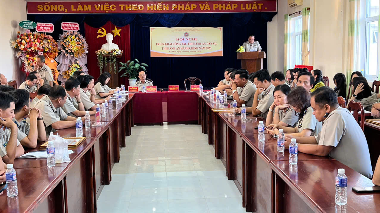 Thực hiện Kế hoạch số 46/KH-CTHADS ngày 10/12/2024 của Cục Thi hành án dân sự tỉnh Cà Mau về việc tổ chức Hội nghị triển khai thực hiện chỉ tiêu, nhiệm vụ công tác Thi hành án dân sự (THADS), thi hành án hành chính (THAHC) năm 2025. Chiều ngày 25/12/2024, Cục THADS tỉnh Cà Mau tổ chức Hội nghị triển khai công tác THADS, THAHC năm 2025. Chủ trì hội nghị đồng chí Huỳnh Hoàng Khâm - Cục trưởng Cục THADS tỉnh Cà Mau, cùng tham dự Hội nghị có các đồng chí lãnh đạo Cục, lãnh đạo các Chi cục cùng toàn thể công chức, người lao động thuộc Cục và các Chi cục trực thuộc.