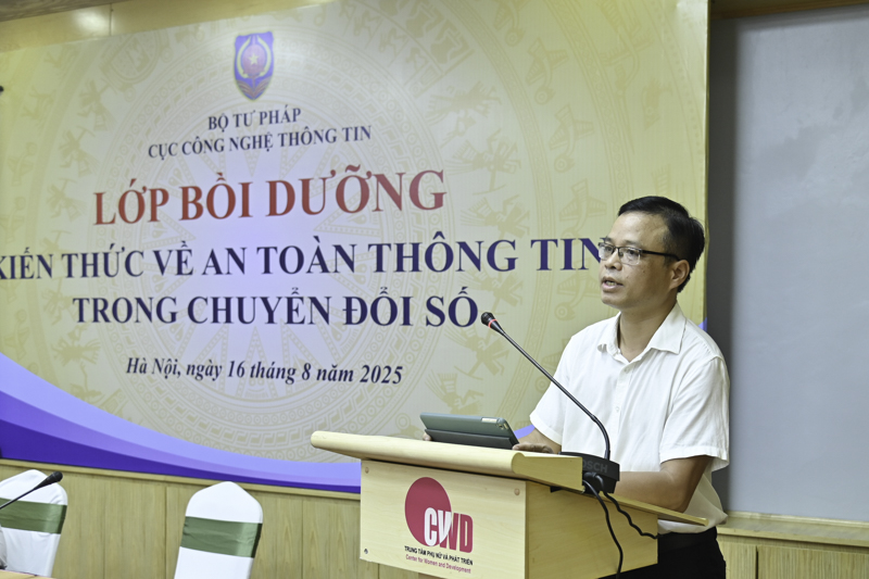Nhằm cập nhật kiến thức chuyên sâu, trang bị kỹ năng nhận diện và xử lý các rủi ro về an toàn thông tin trong môi trường số cho cán bộ, công chức, viên chức (CBCCVC) các đơn vị thuộc Bộ Tư pháp, Cục Công nghệ thông tin tổ chức Lớp bồi dưỡng kiến thức về an toàn thông tin trong chuyển đổi số. Lớp bồi dưỡng có sự tham gia giảng dạy của đội ngũ cán bộ có chuyên môn cao đến từ Cục An ninh mạng và phòng, chống tội phạm sử dụng công nghệ cao (A05) - Bộ Công an. Đây là lực lượng chuyên trách, giữ vai trò nòng cốt trong công tác đảm bảo an ninh mạng quốc gia và phòng chống tội phạm công nghệ cao hiện nay.
