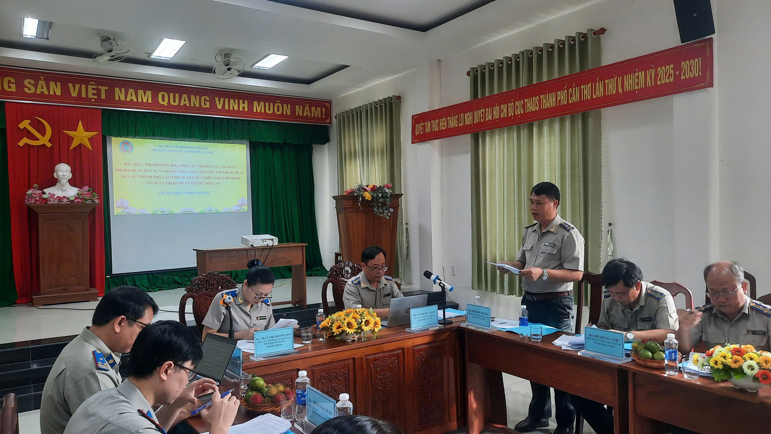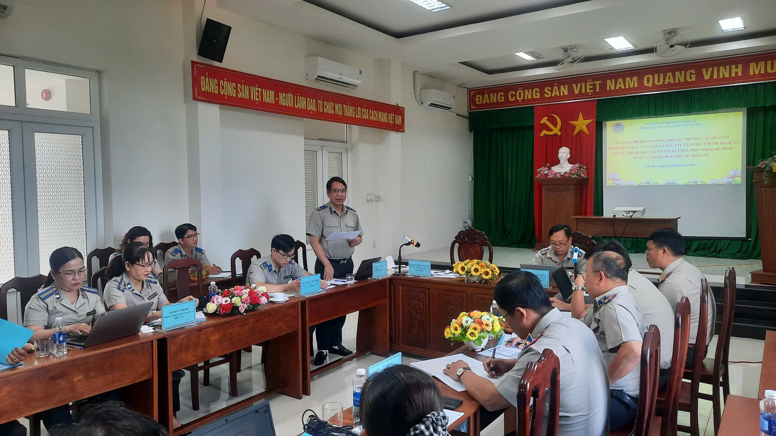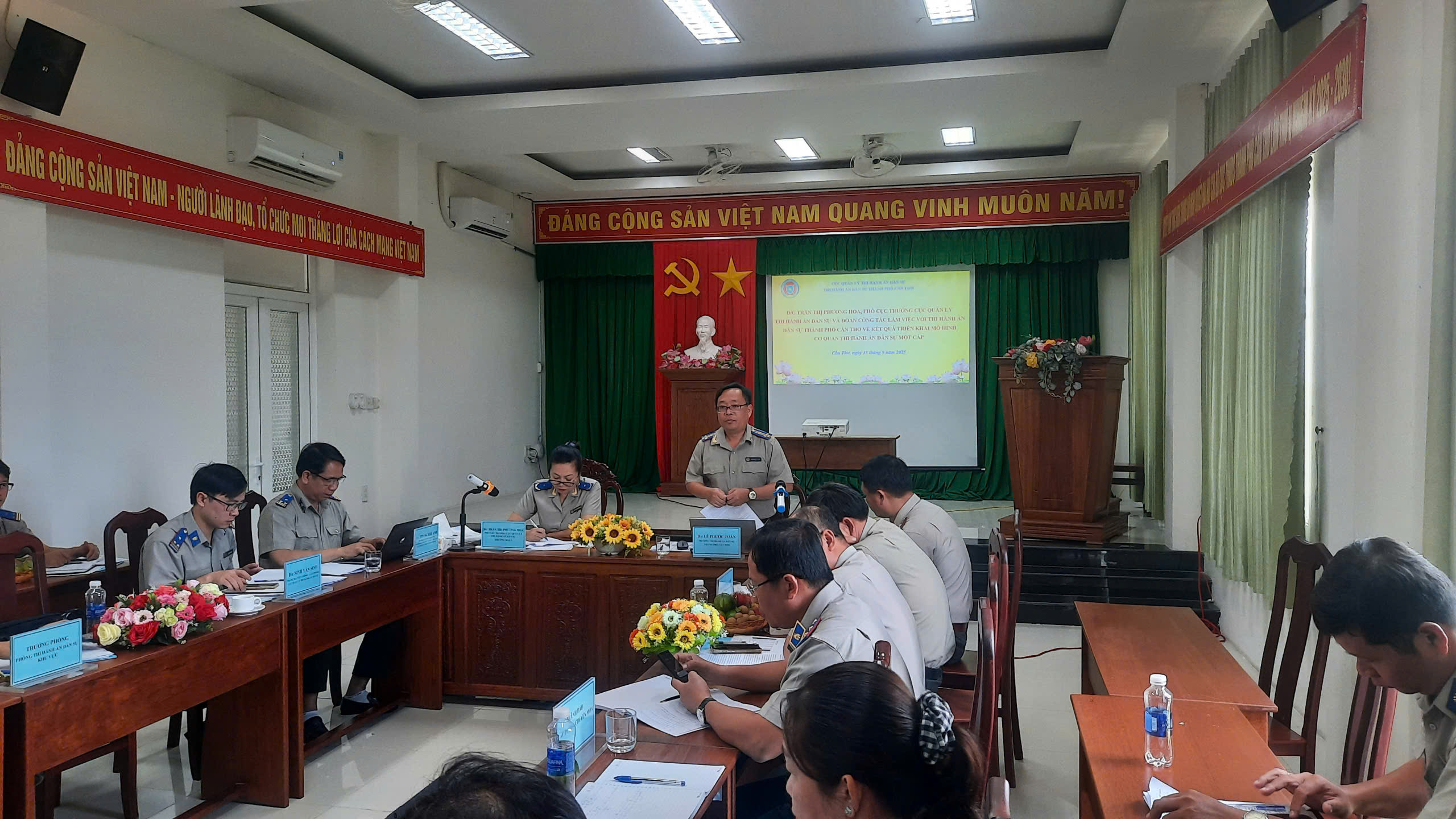 Sáng ngày 15/9/2025, đoàn công tác của Cục Quản Thi hành án dân sự gồm có: Đồng chí Trần Thị Phương Hoa, Phó Cục trưởng – Trưởng đoàn; đồng chí Hoàng Thế Anh, Trưởng ban Ban Nghiệp vụ Thi hành án dân sự và Thừa phát lại và đồng chí Ninh Văn Sinh, Thẩm tra viên chính Văn phòng Cục Quản Thi hành án dân sự đã có buổi làm việc với Thi hành án dân sự thành phố Cần Thơ để đôn đốc thực hiện chỉ tiêu, nhiệm vụ năm 2025 và kết quả vận hành cơ quan Thi hành án dân sự một cấp. Về phía Thi hành án dân sự thành phố Cần Thơ, thành phần tham gia buổi làm việc có các đồng chí lãnh đạo Thi hành án dân sự thành phố, lãnh đạo các phòng chuyên môn và tương đương; Trưởng phòng Thi hành án dân sự các khu vực trực thuộc.