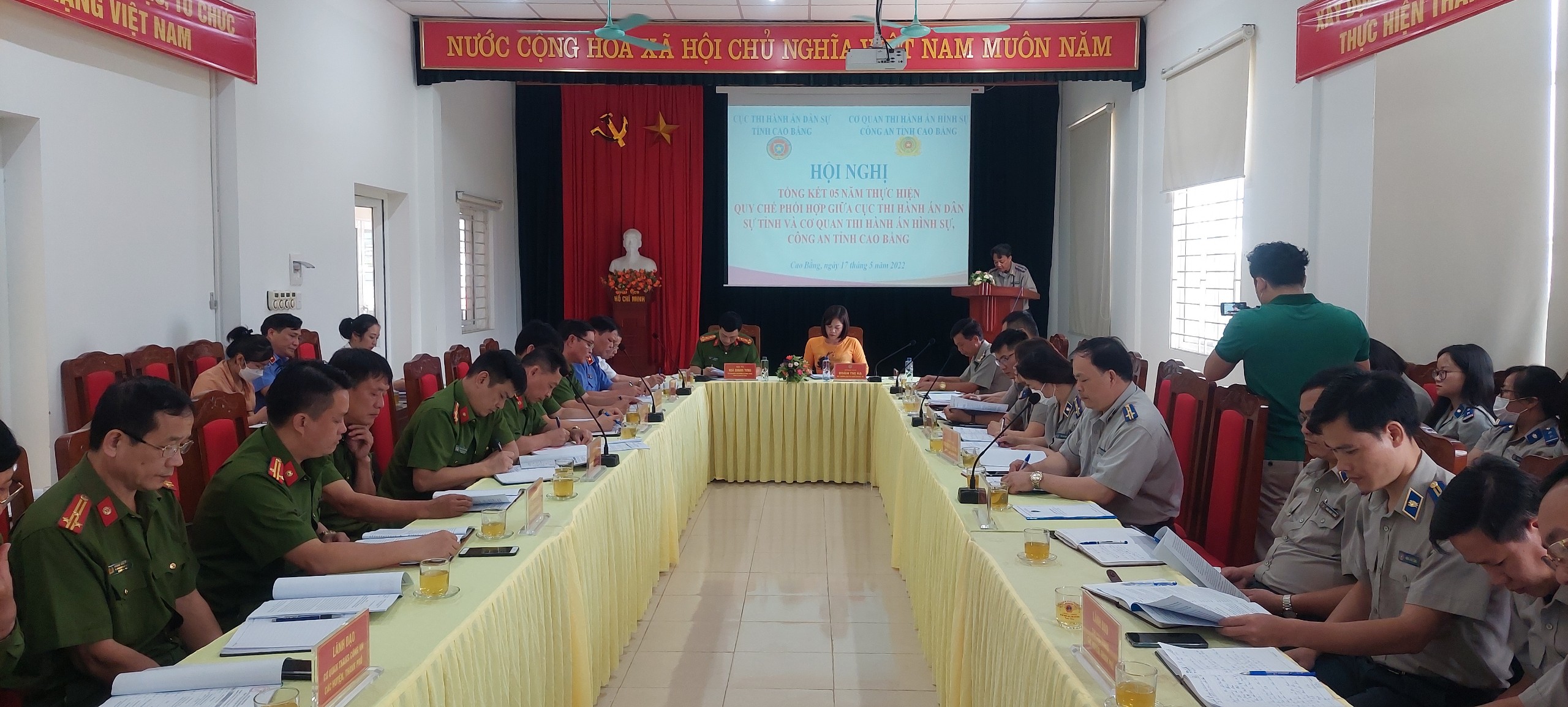 Chiều ngày 17 tháng 5 năm 2022, Cục Thi hành án dân sự (THADS) tỉnh đã phối hợp với cơ quan Thi hành án hình sự (THAHS), Công an tỉnh tổ chức Hội nghị tổng kết 5 năm thực hiện Quy chế phối hợp giữa Cục THADS với cơ quan THAHS, Công an tỉnh Cao Bằng. Đồng chủ trì Hội nghị có: đồng chí đại tá Hòa Quang Tưng, Phó Giám đốc, Thủ trưởng cơ quan THAHS - Công an tỉnh; đồng chí Đoàn Thị Hạ - Cục trưởng Cục THADS tỉnh. Tham dự Hội nghị còn có các đồng chí đại diện Lãnh đạo Viện kiểm sát nhân dân; Tòa án nhân dân tỉnh; Thủ trưởng một số phòng thuộc Công an tỉnh và Thủ trưởng cơ quan THAHS các huyện, thành phố; Về phía Cục THADS có các đồng chí Phó Cục trưởng, đại diện Lãnh đạo các Phòng chuyên môn, Chấp hành viên, Thẩm tra viên, Thư ký thuộc Cục và Chi cục trưởng Chi cục THADS các huyện, thành phố.