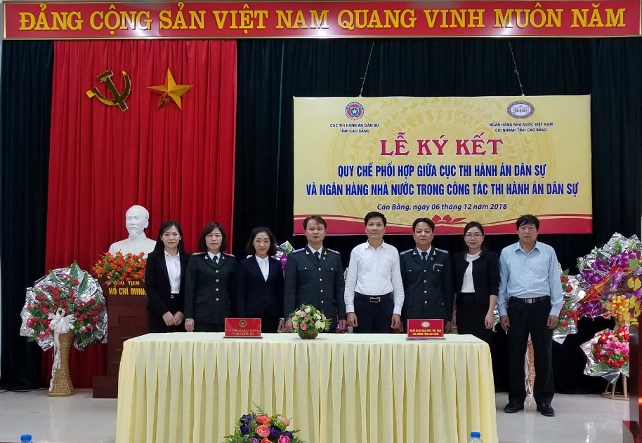 Để tăng cường hiệu quả của công tác thi hành án dân sự liên quan đến hoạt động ngân hàng, ngày 06/12/2018, Cục Thi hành án dân sự (THADS) tỉnh Cao Bằng phối hợp với Ngân hàng Nhà nước Việt Nam (NHNN) chi nhánh tỉnh Cao Bằng long trọng tổ chức Lễ ký kết Quy chế phối hợp giữa hai ngành trong công tác thi hành án dân sự.