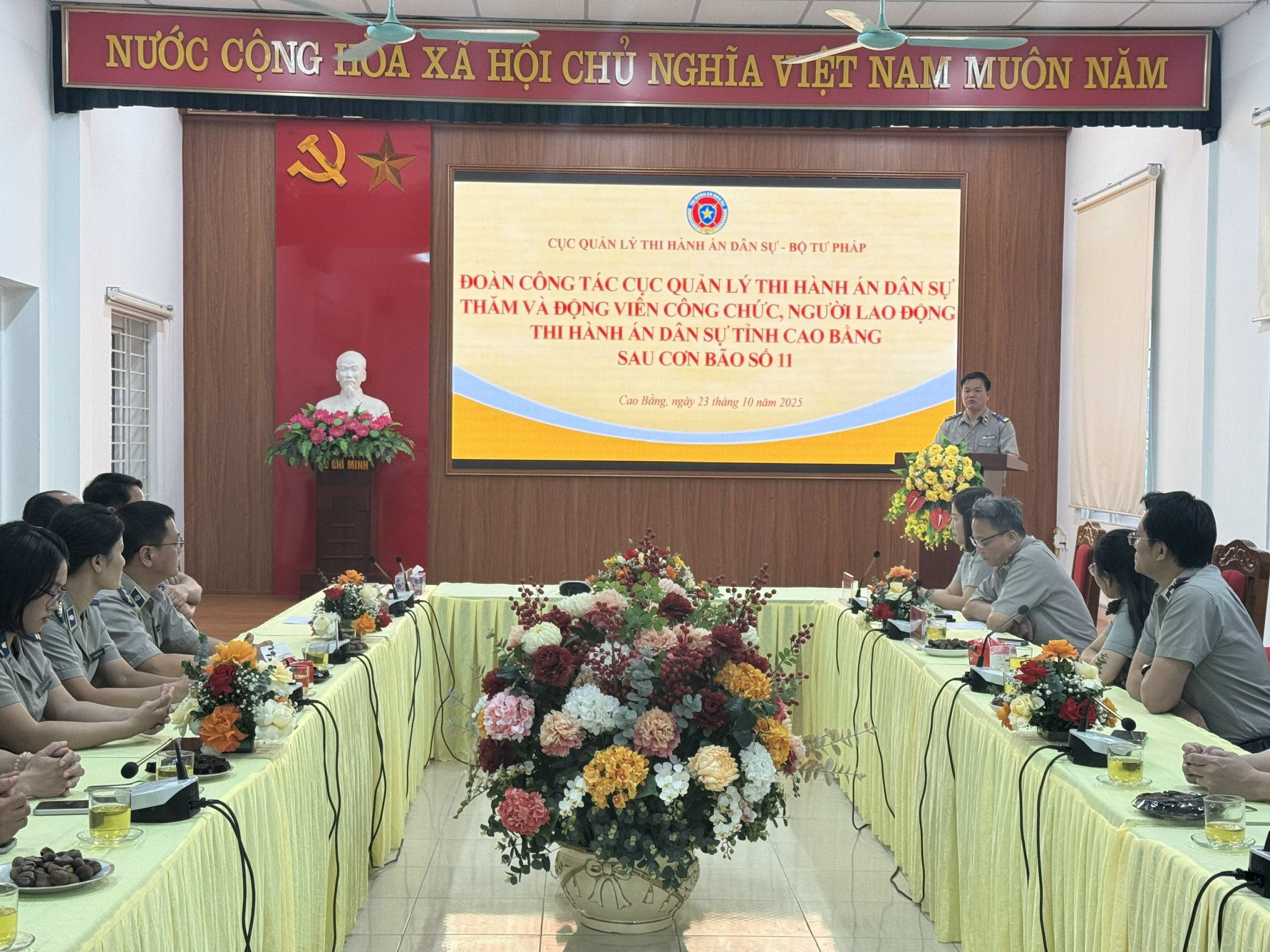 Chiều ngày 23/10/2025, tại trụ sở Thi hành án dân sự tỉnh Cao Bằng, Đoàn công tác của Cục Quản lý Thi hành án dân sự, Bộ Tư pháp đã có buổi thăm, làm việc và trao hỗ trợ nhằm động viên tập thể công chức, người lao động Thi hành án dân sự tỉnh Cao Bằng bị ảnh hưởng bởi cơn bão số 11.