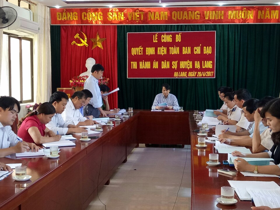 Thực hiện Thông tư liên tịch số 05/2016/TTLT-BTP-BCA-BTC-TANDTC-VKSNDTC ngày 19/05/2016 của Bộ Tư pháp-Bộ Công an-Bộ Tài chính-Tòa án nhân dân Tối cao-Viện Kiểm sát nhân dân Tối cao quy định hoạt động của Ban Chỉ đạo thi hành án dân sự (THADS). Ngày 26/4/2016, Chi cục THADS huyện Hạ Lang đã phối hợp với Văn phòng HĐND và UBND huyện tham mưu cho UBND huyện tổ chức Lễ công bố Quyết định kiện toàn Ban Chỉ đạo THADS huyện Hạ Lang. Tham dự buổi lễ có đồng chí Nông Tiến Dũng - Phó Cục trưởng Cục THADS tỉnh Cao Bằng, đồng chí Đoàn Quốc Chính - Phó Bí thư Huyện ủy, Chủ tịch UBND huyện, Trưởng ban Chỉ đạo THADS huyện Hạ Lang; các đồng chí là Thành viên Ban Chỉ đạo, Tổ thư ký giúp việc Ban Chỉ đạo THADS huyện; đại diện Lãnh đạo Viện Kiểm sát nhân dân huyện, Ban Pháp chế HĐND huyện, các đồng chí trong Đoàn công tác của Cục THADS và toàn thể công chức, người lao động Chi cục THADS huyện Hạ Lang.