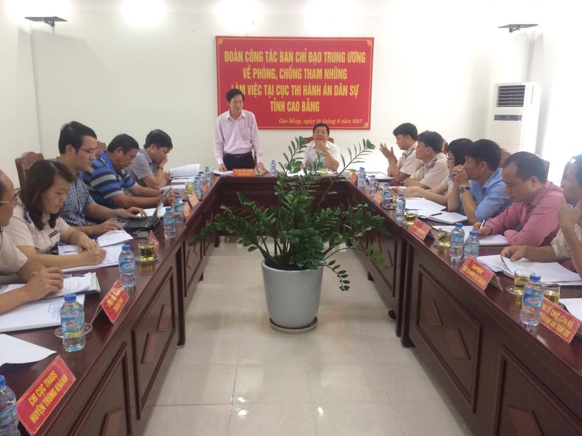 Thực hiện Kế hoạch của Đoàn công tác số 04 – Ban Chỉ đạo Trung ương về phòng, chống tham nhũng về kiểm tra, giám sát việc thanh tra vụ việc; khởi tố, điều tra, truy tố, xét xử các vụ án tham nhũng, kinh tế nghiêm trọng, phức tạp, dự luận xã hội quan tâm tại tỉnh Cao Bằng, ngày 15 tháng 8 năm 2017, Đoàn công tác số 04 (Tổ số 01) do đồng chí Mai Ngọc Dương – Hàm Vụ trưởng, Vụ theo dõi xử lý các vụ án, Ban Nội chính Trung ương làm Trưởng đoàn đã làm việc tại Cục Thi hành án dân sự tỉnh Cao Bằng.