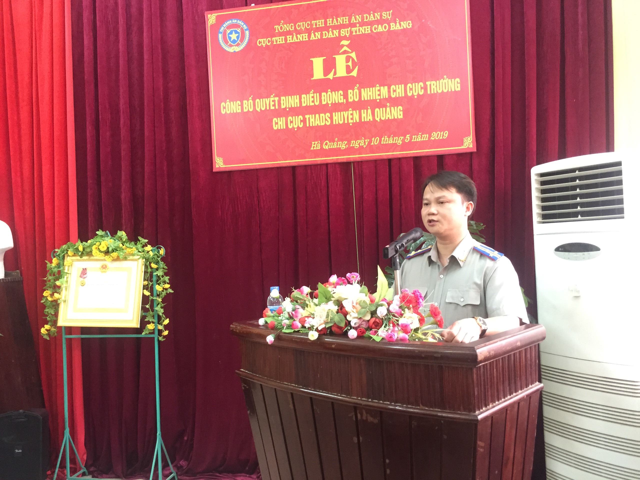 Sau khi thực hiện các nghi thức theo quy định, được lãnh đạo Cục THADS phân công đồng chí Hoàng Thị Son – Trưởng phòng Tổ chức cán bộ công bố Quyết định bổ nhiệm Chi cục trưởng Chi cục THADS huyện Hà Quảng đối với đồng chí Chu Thành Hà.