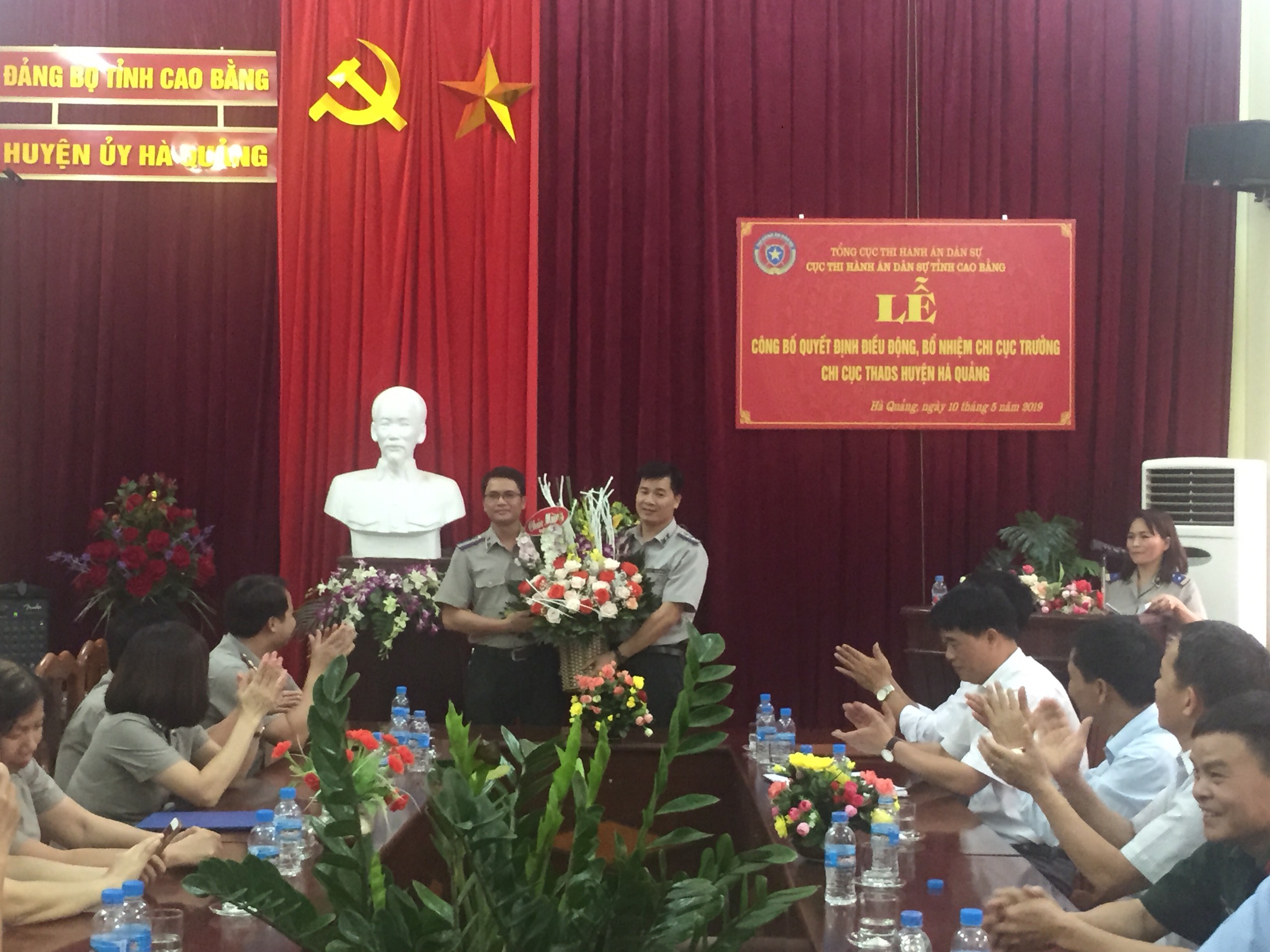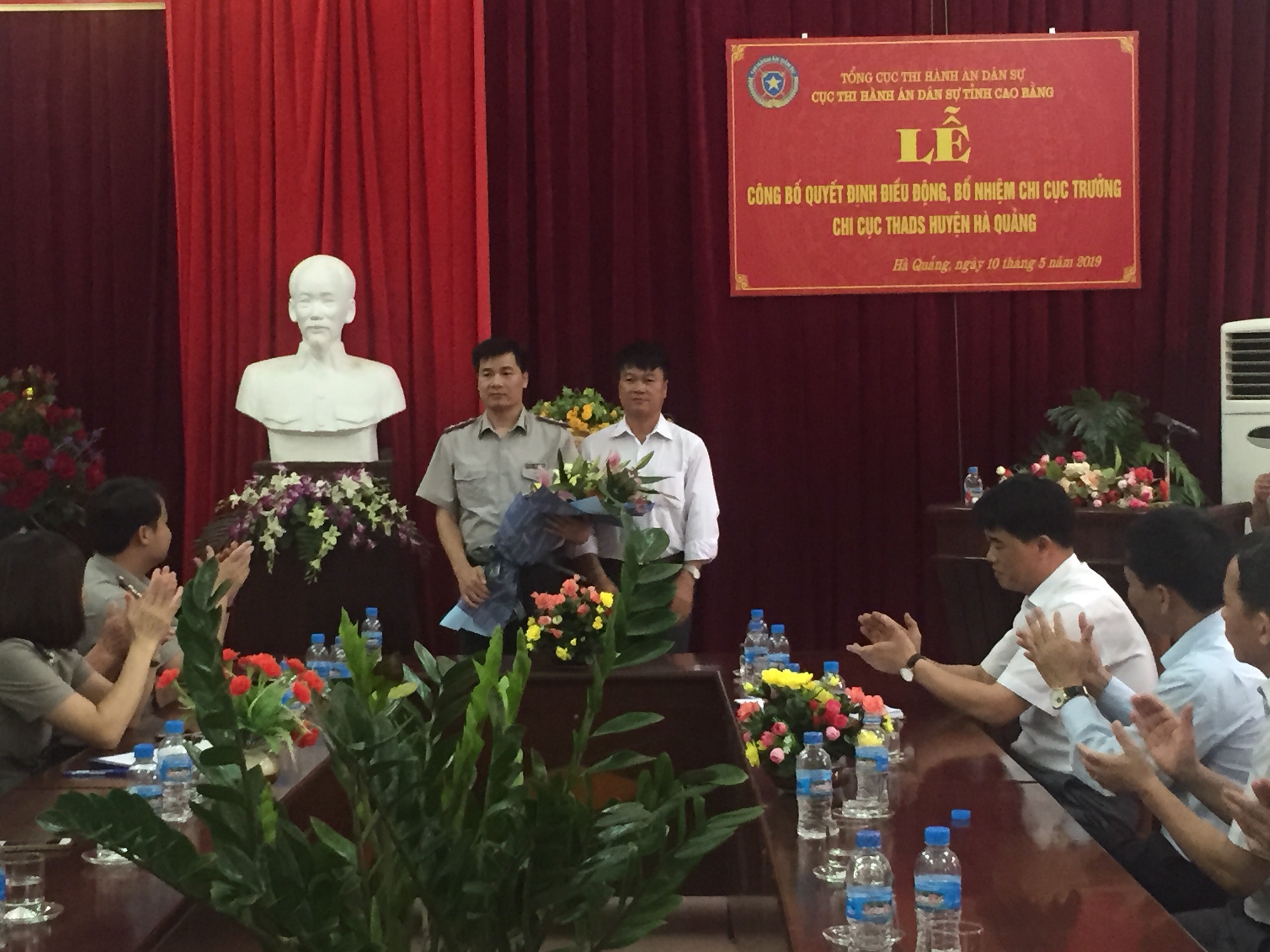 Ngày 10 tháng 5 năm 2019, thực hiện ủy quyền của Tổng cục Thi hành án dân sự, tại Hội trường Huyện ủy huyện Hà Quảng, Cục Thi hành án dân sự tỉnh Cao Bằng đã long trọng tổ chức Lễ công bố Quyết định bổ nhiệm đồng chí Chu Thanh Hà – Phó trưởng Phòng Nghiệp vụ và tổ chức thi hành án Cục Thi hành án dân sự làm Chi cục trưởng Chi cục Thi hành án dân sự huyện Hà Quảng thay thế đồng chí Lý Văn Thòong được điều động giữ công tác khác. Đây là sự kiện quan trọng trong công tác kiện toàn bộ máy lãnh đạo Chi cục Thi hành án dân sự, kịp thời bổ sung đội ngũ lãnh đạo chất lượng, tạo điều kiện cho các cơ quan Thi hành án dân sự trên địa bàn tỉnh đẩy nhanh tiến độ tổ chức thi hành án góp phần thực hiện hoàn thành sớm chỉ tiêu, nhiệm vụ được giao.