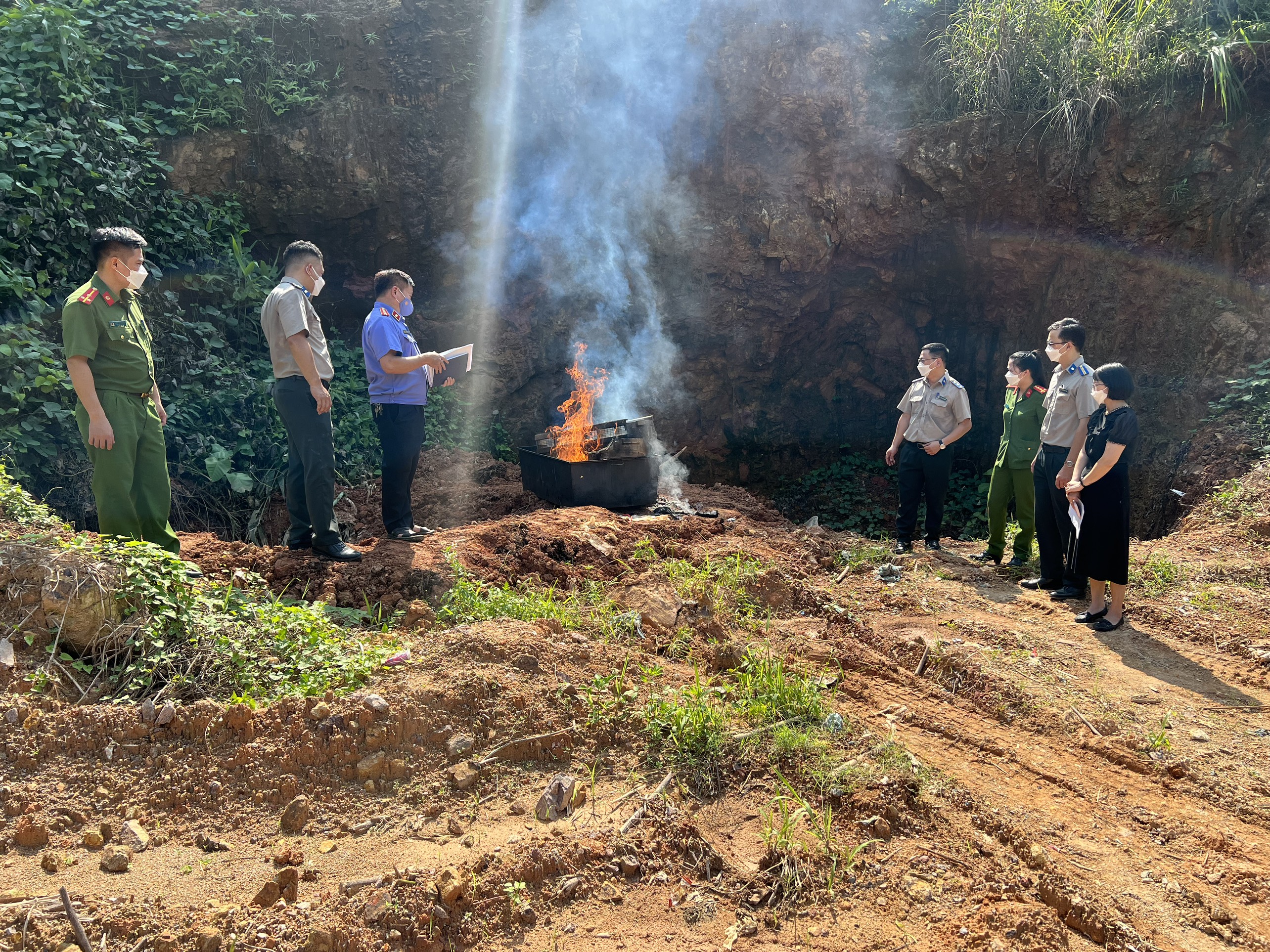 Tại bãi rác Nà Lần xã Chu Trinh, thành phố Cao Bằng Hội đồng thực hiện tiêu hủy đối với các loại vật chứng, tài sản của 7 vụ việc, trong đó có 40 bánh heroin, hơn 600g ma túy đá và các tang vật khác liên quan, như: dao, sim điện thoại, tú lơ khơ, quần áo, dép, thùng cát tông …