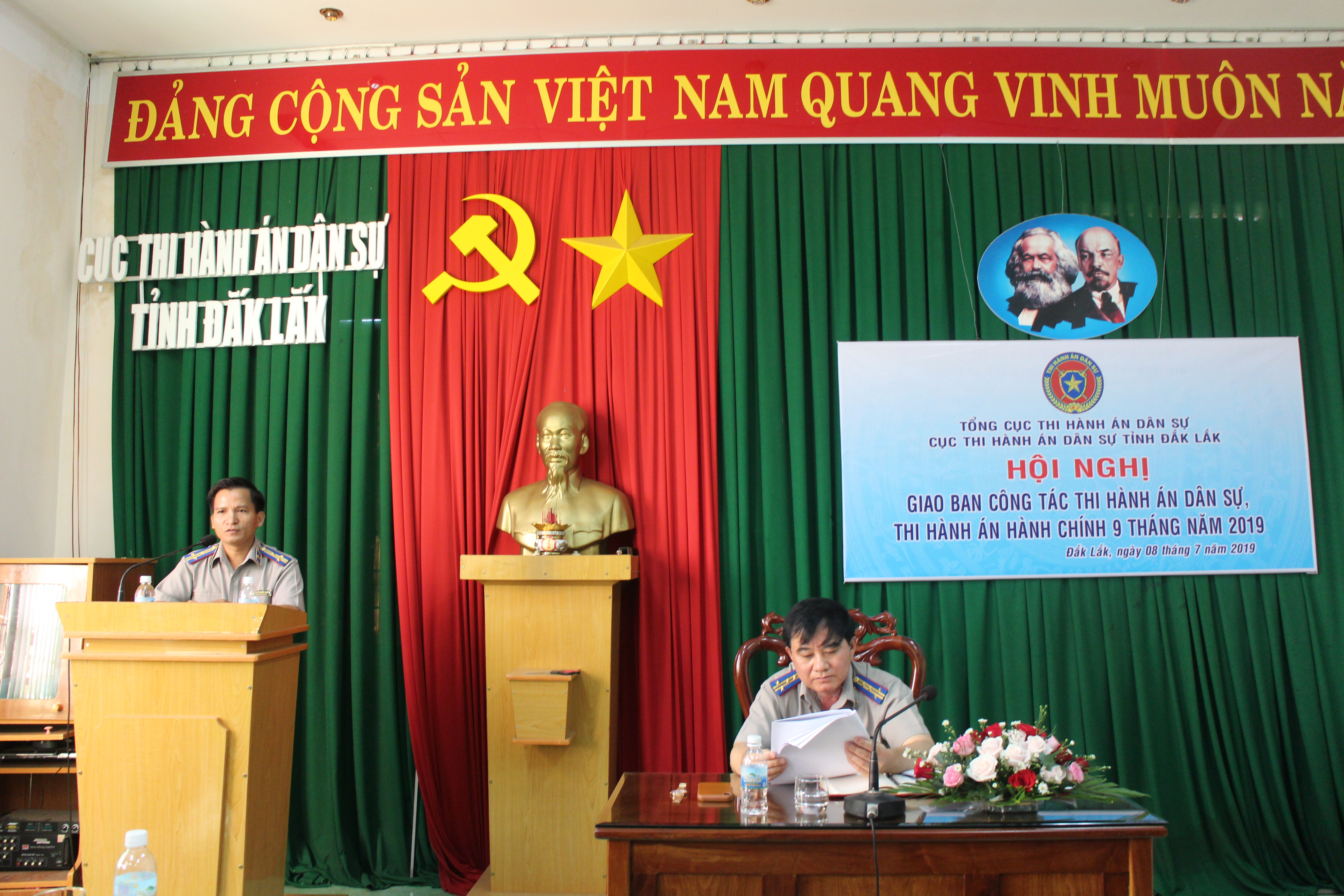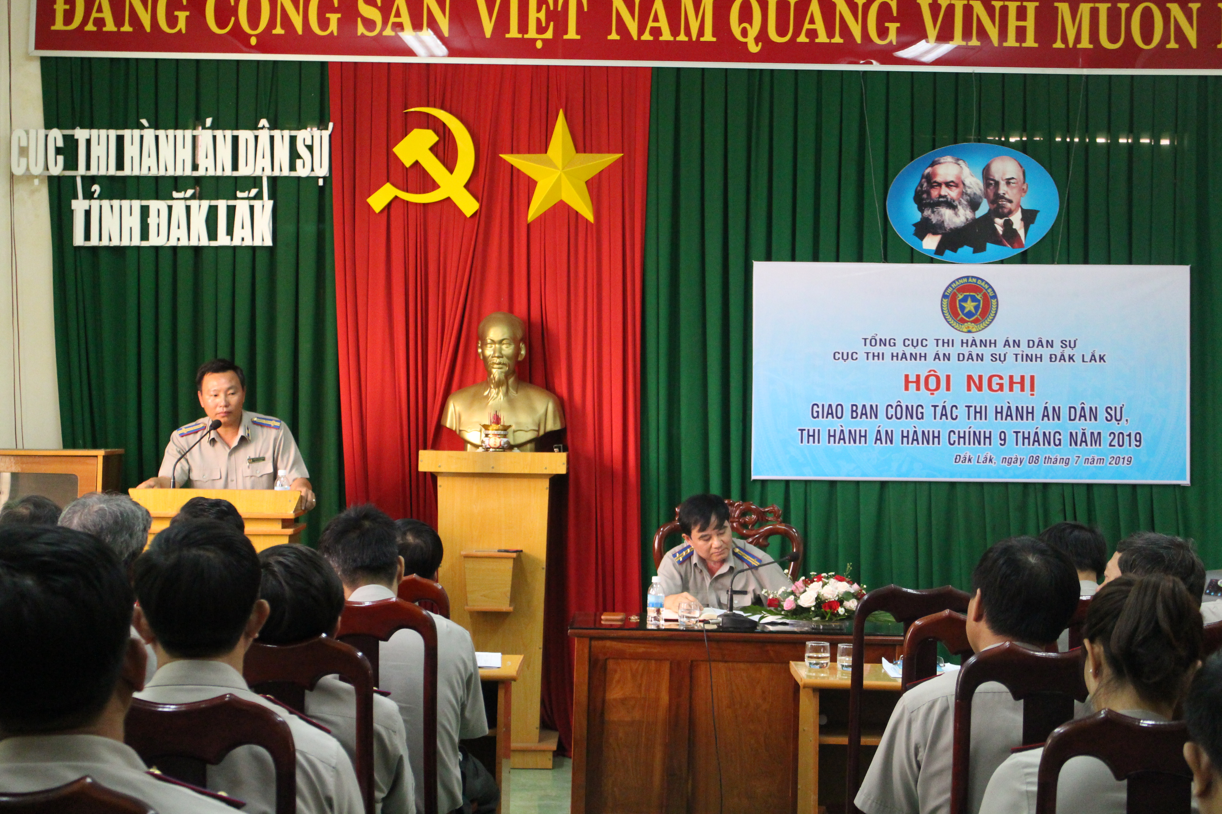 Yêu cầu Thủ trưởng các đơn vị thuộc Cục và Chi cục trưởng Chi cục Thi hành án dân sự trực thuộc phải nêu cao tinh thần trách nhiệm, quyết liệt trong tổ chức thi hành án, triển khai và thực hiện có hiệu quả các phần mềm về thi hành án dân sự, tăng cường kỷ cương, kỷ luật thực thi công vụ, nhất là thời gian làm việc, tính thứ bậc trong cơ quan hành chính nhà nước. Yêu cầu các Cơ quan Thi hành án dân sự trong tỉnh thực hiện có hiệu quả công tác phòng ngừa tiêu cực, tham nhũng trong hoạt động thi hành án dân sự, chú trọng và thường xuyên kiểm tra việc thực hiện nghiêm túc chế độ tài chính, kế toán và kế toán nghiệp vụ thi hành án, việc quản lý, bảo vệ trụ sở, kho vật chứng, quản lý tài sản công, nhất là xử dụng xe ô tô công của các Chi cục phải đúng quy định, nghiêm cấm việc sử dụng xe ô tô công vào việc riêng (cá nhân). Đồng thời đồng chí Cục trưởng cũng yêu cầu toàn Hệ thống phải tập trung và quyết liệt trong tổ chức thi hành án, để thi hành dứt điểm những vụ việc có điều kiện thi hành, nhất là những vụ án lớn, những vụ việc có liên quan đến tổ chức tín dụng, ngân hàng, án tham nhũng, kinh tế và thi hành phần dân sự trong các bản án hình sự, nhằm tăng mạnh số tiền thực thu đến 30/9/2019, Hệ thống Thi hành án dân sự tỉnh Đắk Lắk hoàn thành đạt và vượt các chỉ tiêu, nhiệm vụ do Bộ Tư pháp và Tổng cục Thi hành án dân sự giao trong năm 2019.