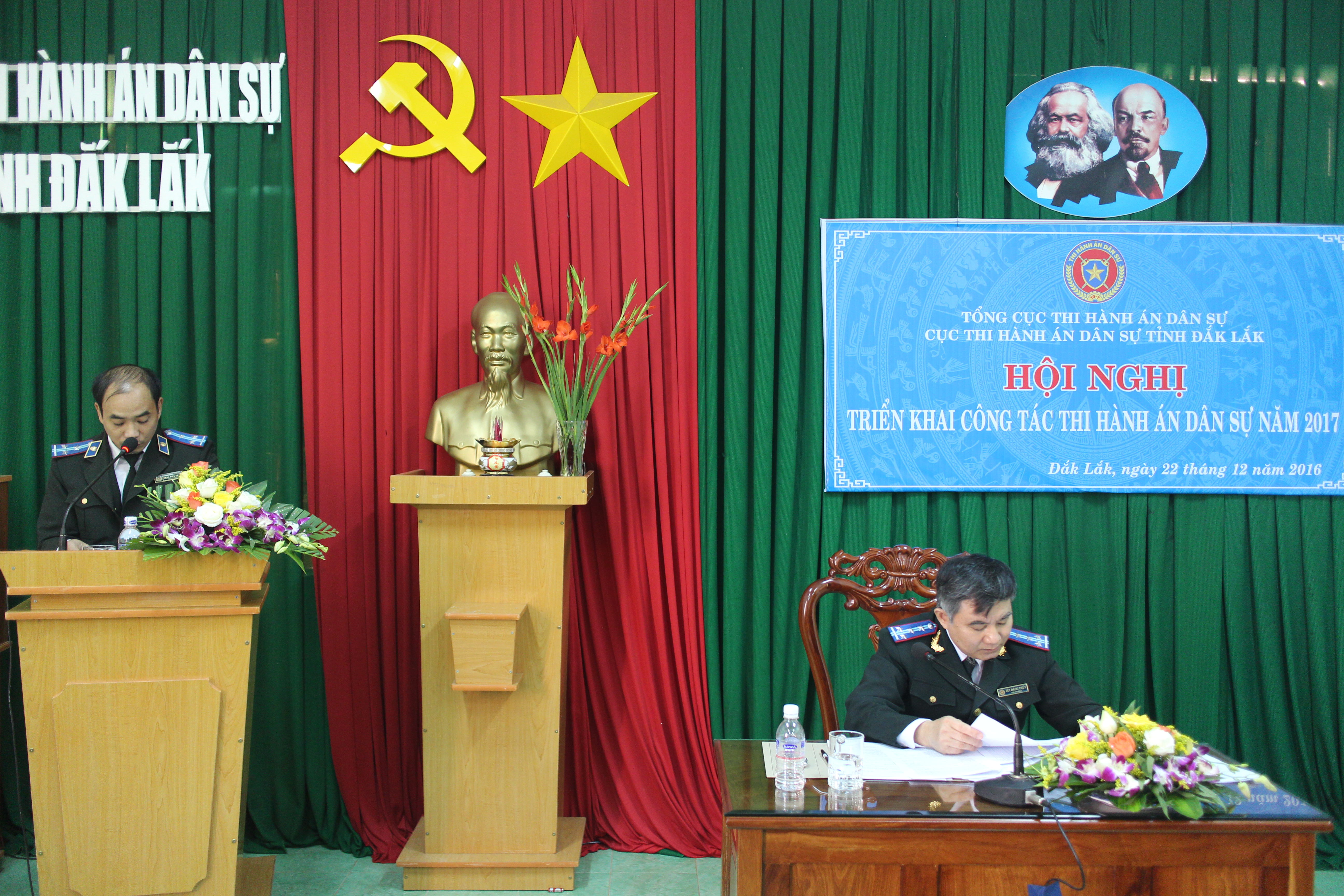 Ngày 22/12/2016, Cục Thi hành án dân sự tỉnh Đắk Lắk tổ chức Hội nghị triển khai công tác thi hành án dân sự năm 2017. Thành phần tham dự Hội nghị gồm có các đồng chí lãnh đạo Cục, Trưởng, Phó phòng chuyên môn và tương đương thuộc Cục, Chấp hành viên Cục Thi hành án dân sự tỉnh; Chi cục trưởng Chi cục Thi hành án dân sự trực thuộc, Chấp hành viên Chi cục Thi hành án dân sự thành phố Buôn Ma Thuột và một số đại biểu đại diện các Sở, Ban, Ngành của tỉnh. Đồng chí Bùi Đăng Thủy - Bí thư Đảng ủy Cục, Cục trưởng Cục Thi hành án dân sự tỉnh chủ trì Hội nghị.