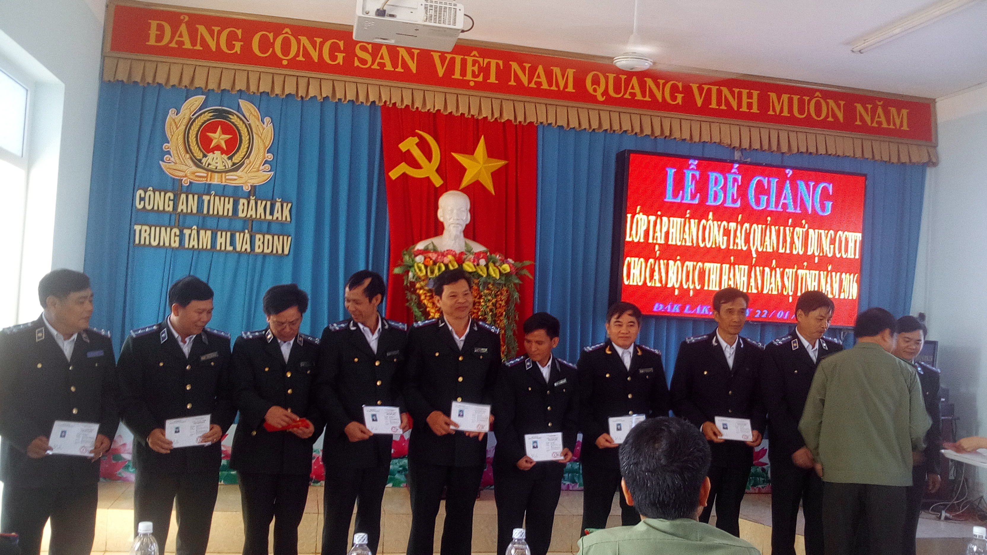 Ngày 18/01/2016, tại Trung tâm Huấn luyện và bồi dưỡng nghiệp vụ Công an tỉnh Đắk Lắk, Cục Thi hành án dân sự tỉnh Đắk Lắk đã phối hợp với Công an tỉnh Đắk Lắk tổ chức mở lớp tập huấn công tác quản lý, sử dụng công cụ hỗ trợ cho lực lượng Chấp hành viên các cơ quan Thi hành án dân sự tỉnh Đắk Lắk. Tham dự khóa tập huấn có đồng chí Bùi Đăng Thủy – Bí thư Đảng ủy Cục – Cục trưởng cục Thi hành án dân sự tỉnh, Lãnh đạo Cục, Chi cục trưởng các Chi cục Thi hành án dân sự trực thuộc và toàn thể Chấp hành viên các cơ quan Thi hành án dân sự trong tỉnh.
