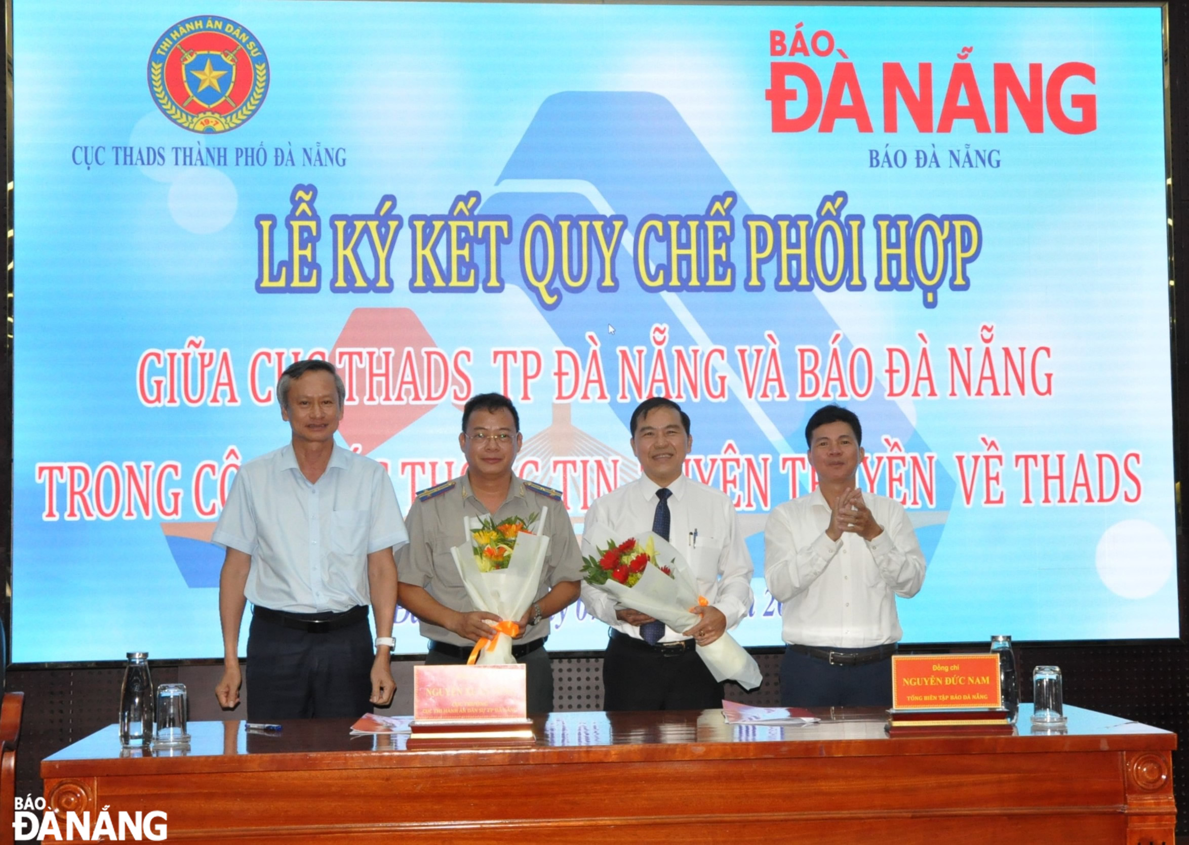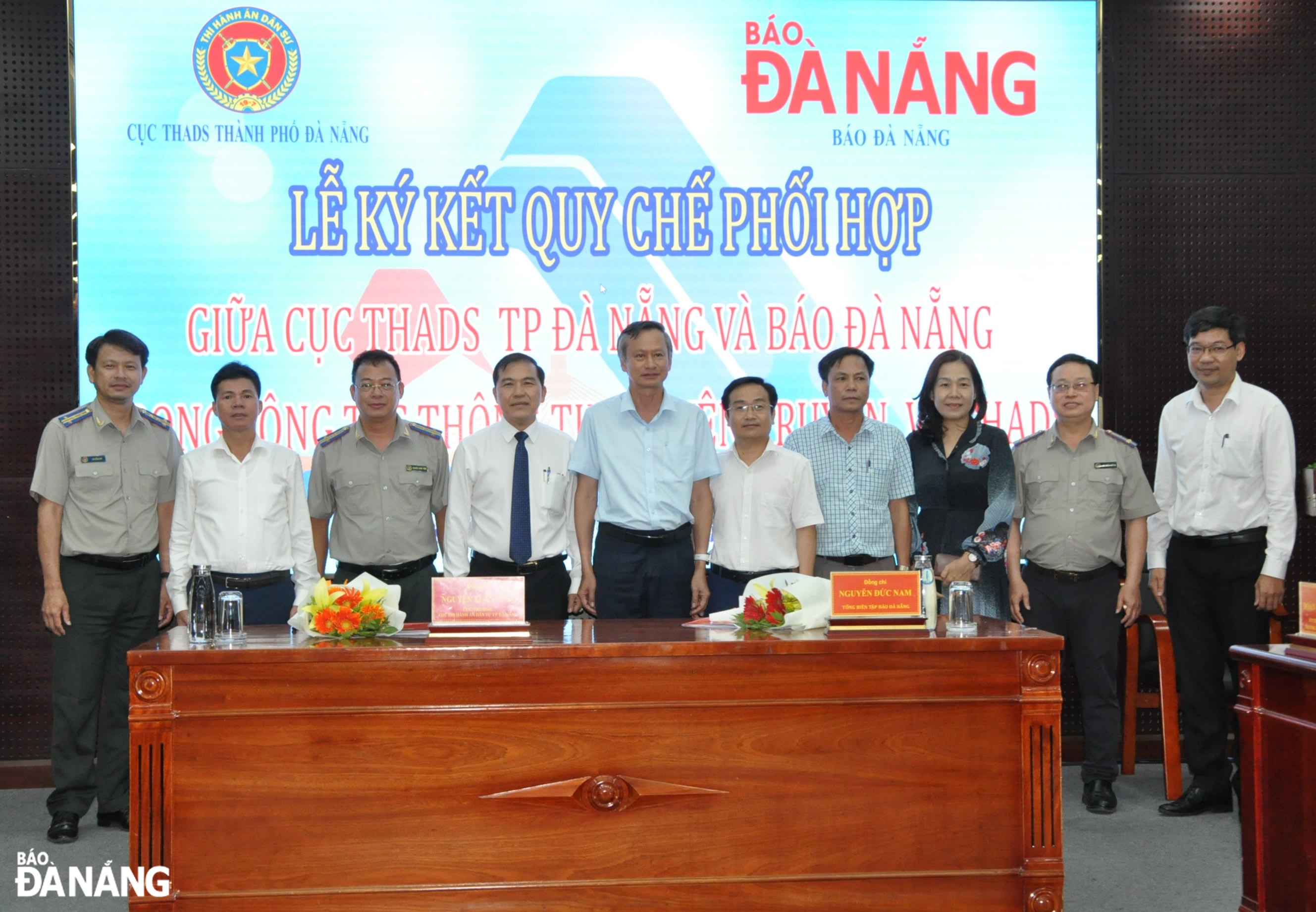 Tổng Biên tập Báo Đà Nẵng Nguyễn Đức Nam (bên phải) và Cục trưởng Cục THADS thành phố Nguyễn Xuân Tùng ký kết và trao Quy chế phối hợp trong công tác thông tin, tuyên truyền về THADS