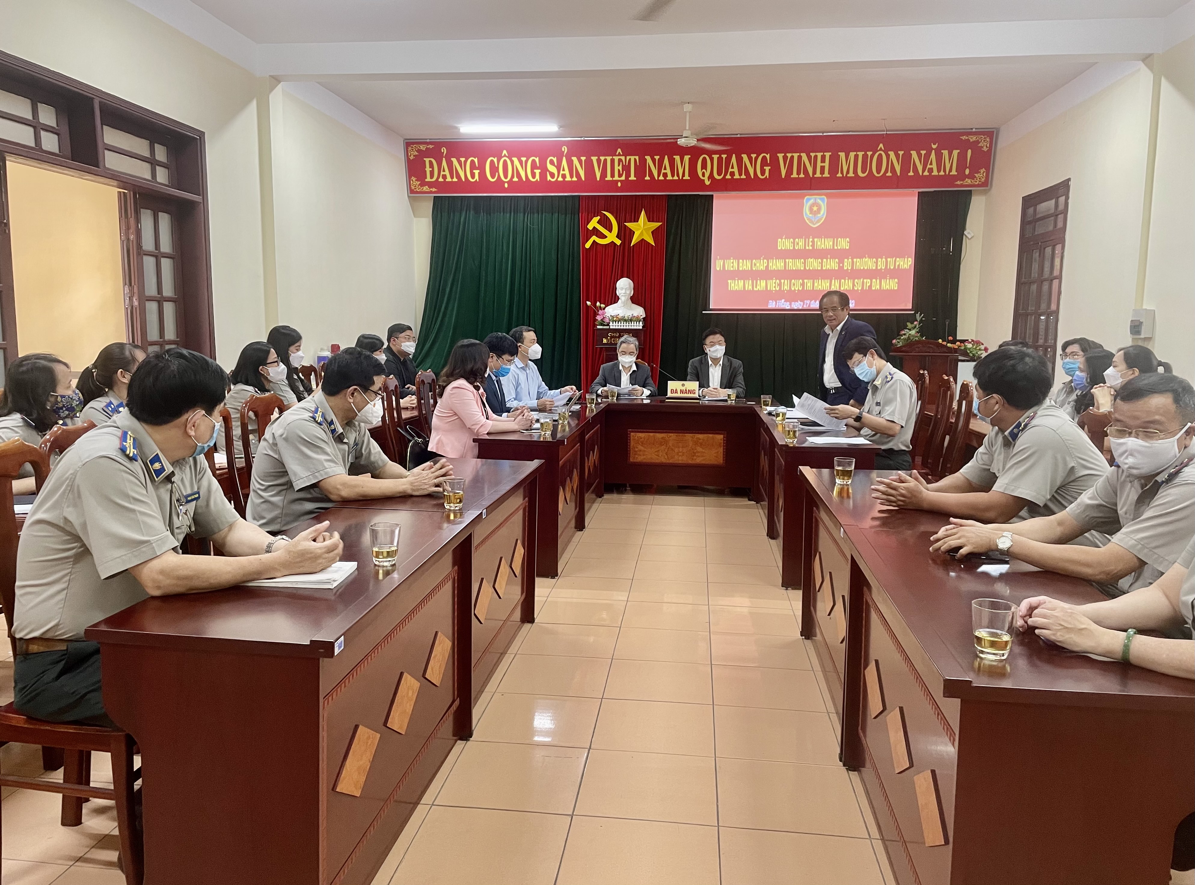 Thay mặt Cục THADS thành phố Đà Nẵng, Cục trưởng báo cáo với Bộ trưởng và đoàn công tác kết quả công tác 03 tháng đầu năm 2022. Thời gian vừa qua, đại dịch Covid-19 diễn biến phức tạp, tác động nghiêm trọng đến tình hình phát triển kinh tế - xã hội của cả nước nói chung và thành phố Đà Nẵng nói riêng, ảnh hưởng đến kết quả thực hiện chỉ tiêu, nhiệm vụ của cơ quan Thi hành án dân sự trên địa bàn thành phố. Bên cạnh đó, hiện nay Cục Thi hành án dân sự thành phố Đà Nẵng đang tổ chức thi hành 06 vụ, việc do Ban chỉ đạo phòng chống tham nhũng, tiêu cực Trung ương theo dõi, chỉ đạo, với tổng số tiền phải thu hồi là 8.526 tỷ đồng; phải xử lý 36 tài sản là bất động sản Bản án tuyên kê biên; 15 tài sản do cơ quan thi hành án xác minh, truy tìm được. Do vậy, kết quả thi hành án 3 tháng đầu năm 2022 đạt tỷ lệ thấp, cụ thể: Tổng số phải thi hành là 8.297 việc, tương đương số tiền 12.446 tỷ 851 triệu 291 nghìn đồng; đã thi hành xong 1.119 việc, đạt tỉ lệ 20,05%, với số tiền thu được là 749 tỷ 983 triệu 836 nghìn đồng, đạt tỉ lệ 10.44%. Nhận thức rõ những khó khăn trong việc thực hiện nhiệm vụ, chỉ tiêu năm 2022, ngay từ đầu năm Lãnh đạo Cục THADS thành phố đã chỉ đạo các đơn vị THADS trên địa bàn xây dựng kế hoạch công tác phù hợp với tình hình thực tế tại đơn vị, bám sát chỉ đạo, tập trung triển khai nhiều giải pháp quyết liệt, đồng bộ, phấn đấu hoàn thành nhiệm vụ được giao.
