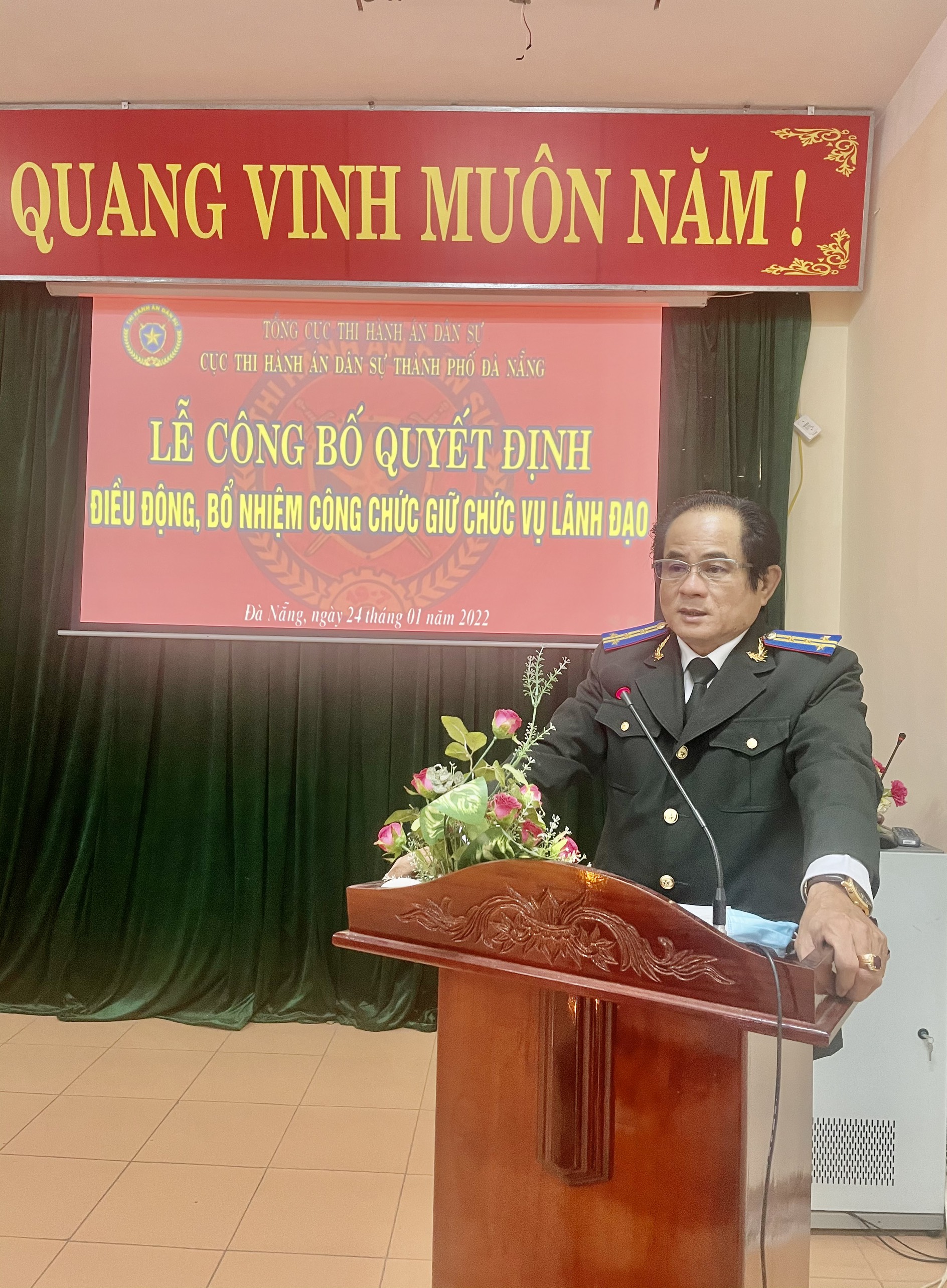 Phát biểu tại buổi lễ Cục trưởng Trần Phước Thu chúc mừng các đồng chí được điều động, bổ nhiệm và nhấn mạnh các đồng chí dù ở đơn vị nào cũng là những người đứng đầu, giữ vị trí quan trọng trong hệ thống thi hành án dân sự thành phố. Cục trưởng hy vọng với bề dày kinh nghiệm công tác, các đồng chí sẽ tiếp tục phát huy những thế mạnh, xây dựng mối quan hệ phối hợp tốt với cơ quan, ban ngành, chính quyền địa phương đưa công tác của các đơn vị đạt hiệu quả cao và ngày càng phát triển, góp phần tích cực vào việc hoàn thành xuất sắc các nhiệm vụ của Thi hành án dân sự thành phố Đà Nẵng trong thời gian tới.