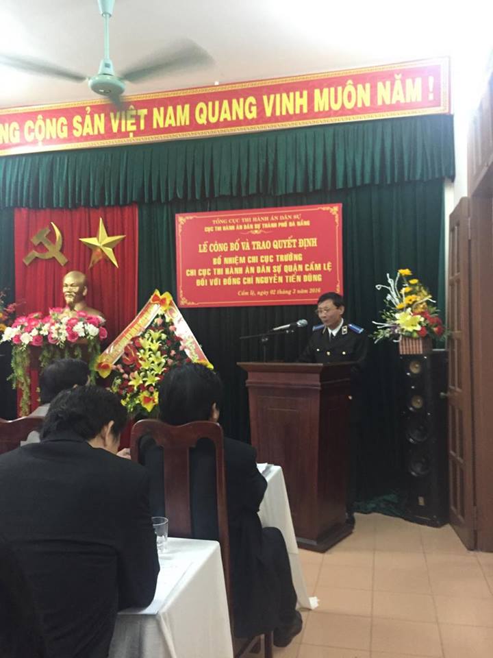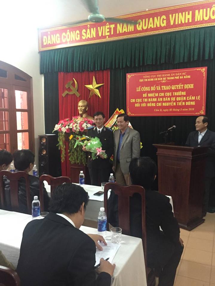 Chiều ngày 02/3/2016, Cục Thi hành án dân sự thành phố Đà Nẵng đã tổ chức lễ công bố, trao Quyết định số 253/QĐ-TCTHADS ngày 26/2/2016 của Tổng cục trưởng Tổng cục Thi hành án dân sự, bổ nhiệm đồng chí Nguyễn Tiến Dũng - Quyền Chi cục trưởng Chi cục Thi hành án dân sự quận Cẩm Lệ giữ chức vụ Chi cục trưởng Chi cục Thi hành án dân sự quận Cẩm Lệ, thành phố Đà Nẵng.