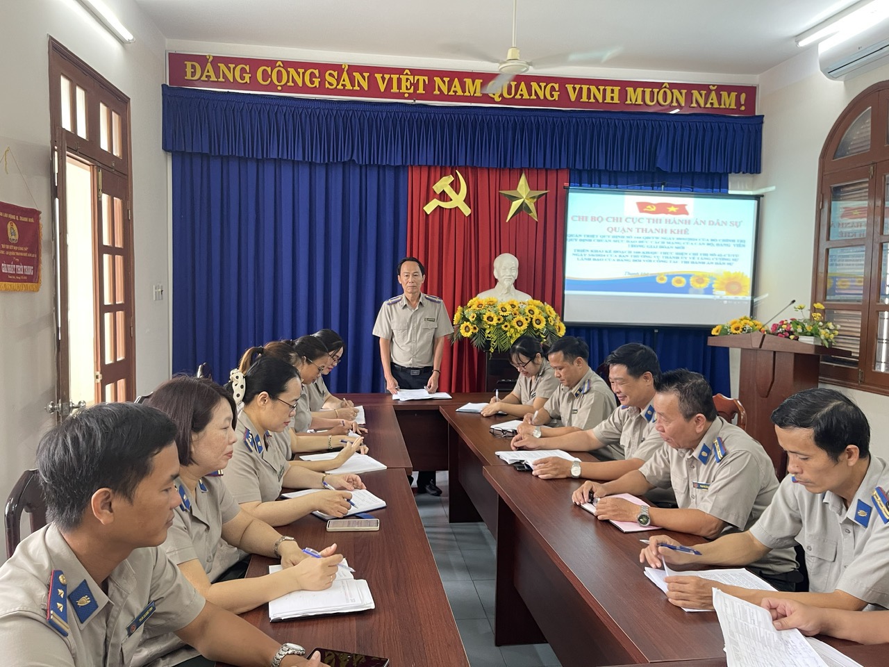 Chi bộ Chi cục Thi hành án dân sự quận Thanh Khê đã xây dựng Dự thảo Kế hoạch thực hiện và có văn bản đề nghị các tổ chức cơ sở đảng thuộc khối nội chính và Đảng ủy 10 Phường đóng góp ý kiến để hoàn thiện dự thảo, trình Ban Thường vụ Quận ủy ban hành Kế hoạch triển khai, thực hiện Chỉ thị trên địa bàn quận. Kế hoạch đã nêu rõ mục đích yêu cầu và xác định rõ vai trò, trách nhiệm của người đứng đầu cấp ủy Đảng, chính quyền, các đơn vị có liên quan trong việc lãnh đạo, chỉ đạo thực hiện công tác thi hành án dân sự trên địa bàn. Các cơ quan, đơn vị có liên quan trong phạm vi chức năng, nhiệm vụ có trách nhiệm phối hợp chặt chẽ, kịp thời, hiệu quả với cơ quan Thi hành án dân sự để chủ động tháo gỡ hoặc đề xuất giải pháp tháo gỡ những khó khăn, vướng mắc trong quá trình tổ chức thi hành bản án theo thẩm quyền.