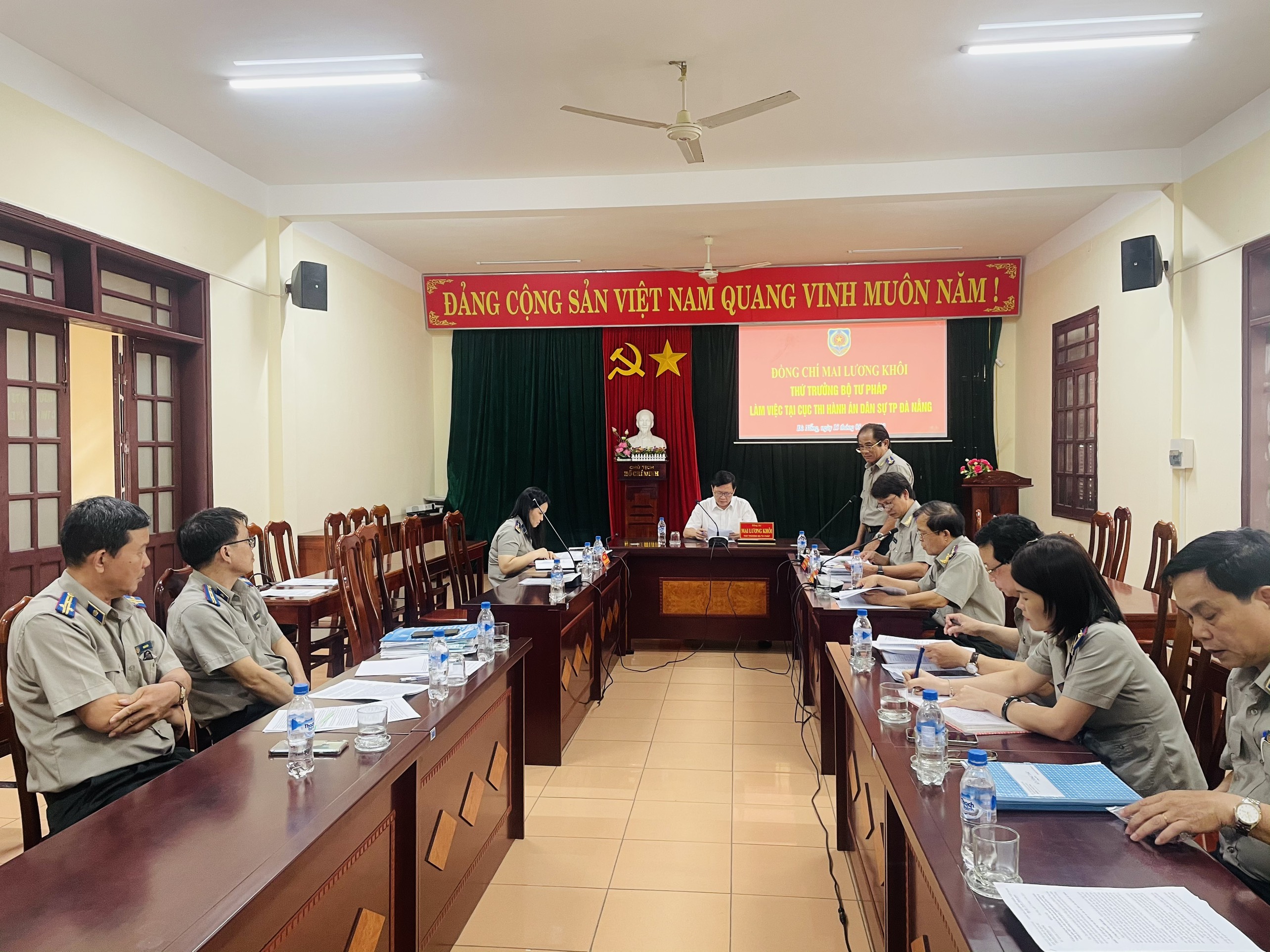 Sáng ngày 15/5/2023, Thứ trưởng Bộ Tư pháp Mai Lương Khôi đã có buổi làm việc với Cục Thi hành án dân sự thành phố Đà Nẵng. Tham gia đoàn công tác có đồng chí Nguyễn Thị Hoàng Giang, Vụ trưởng vụ Nghiệp Vụ 2 - Tổng Cục Thi hành án dân sự. Về phía Cục THADS thành phố có đồng chí Trần Phước Thu, Cục trưởng; Lãnh đạo Cục, lãnh đạo các Phòng chuyên môn thuộc Cục và Chi cục trưởng Chi cục THADS quận Ngũ Hành Sơn đang tổ chức thi hành án hình sự về kinh tế, tham nhũng thuộc diện Ban Chỉ đạo Trung ương về phòng, chống tham nhũng, tiêu cực theo dõi, chỉ đạo.