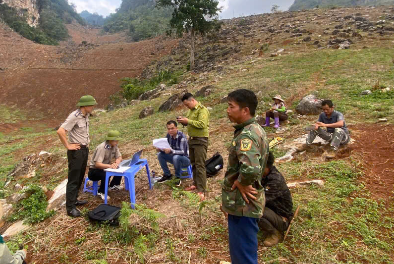 | Chi cục trưởng Phạm Ngọc Hưởng cùng đồng nghiệm tham gia thi hành án một vụ việc tại các xã vùng cao của tỉnh Điện Biên. |