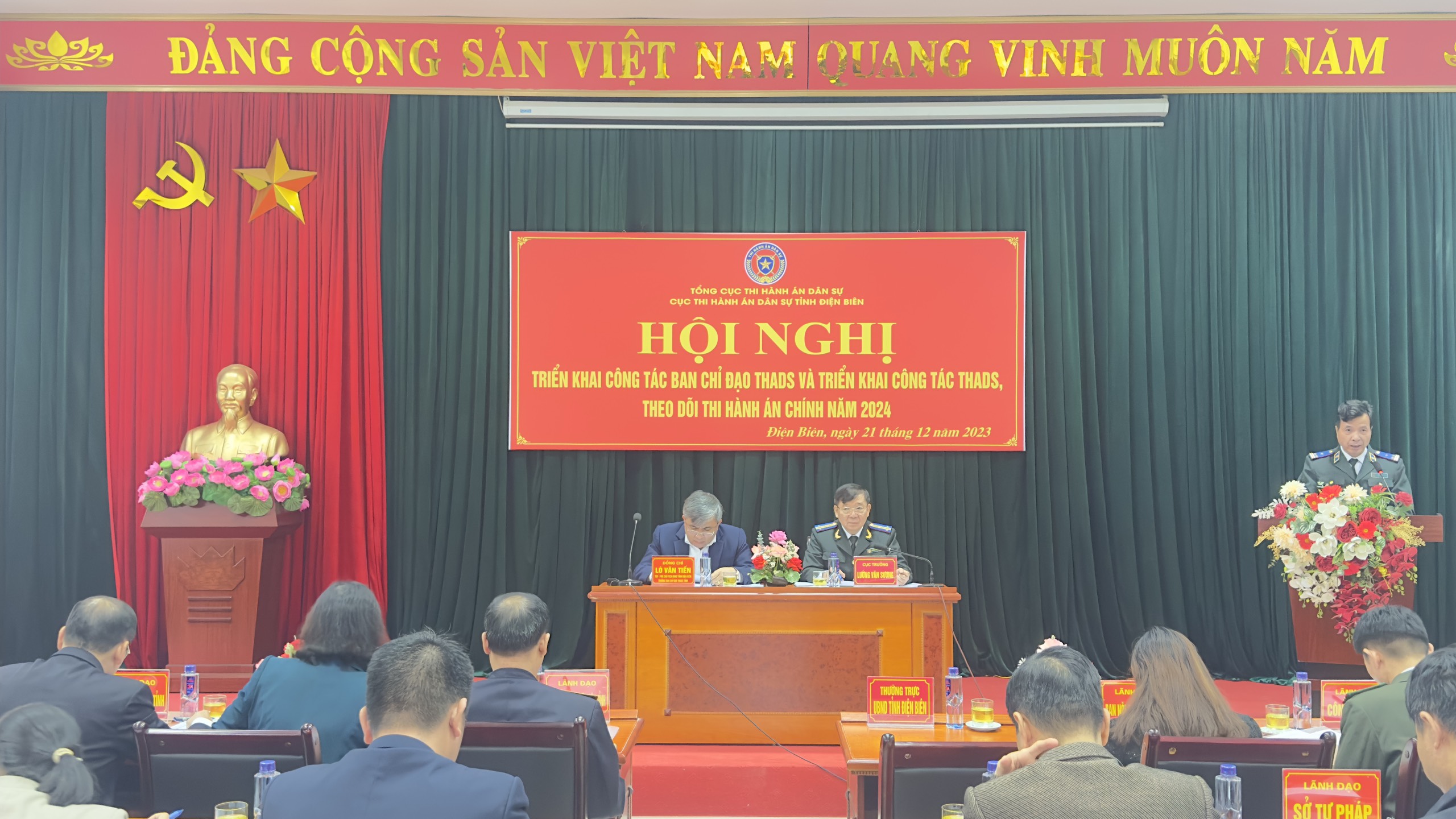 Thực hiện chỉ đạo của Tổng cục Thi hành án dân sự (THADS), được sự nhất trí của UBND tỉnh. Sáng ngày 21/12/2023, Cục THADS tỉnh Điện Biên tổ chức Hội nghị triển khai công tác THADS, theo dõi thi hành án hành chính năm 2024. Đến dự và chỉ đạo Hội nghị có đồng chí Lò Văn Tiến - Tỉnh Ủy viên, Phó Chủ tịch UBND tỉnh, Trưởng ban Chỉ đạo THADS tỉnh; đại diện lãnh đạo Ban Nội chính Tỉnh ủy, Ủy ban Kiểm tra Tỉnh ủy, Ban Pháp chế HĐND tỉnh, Đảng uỷ Khối Cơ quan và Doanh nghiệp tỉnh; đại diện lãnh đạo các ngành là thành viên Ban chỉ đạo THADS tỉnh và một số cơ quan phối hợp. Về phía Cục THADS, có đồng chí Lường Văn Sương, Cục trưởng, đồng chí Phó Cục trưởng, lãnh đạo các phòng thuộc Cục, Chi cục trưởng Chi cục THADS cấp huyện trực thuộc và công chức tại Cục THADS tỉnh.
