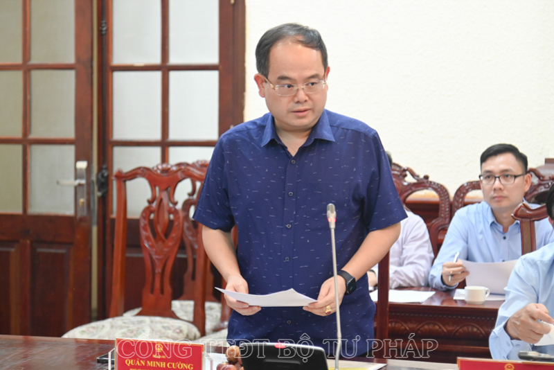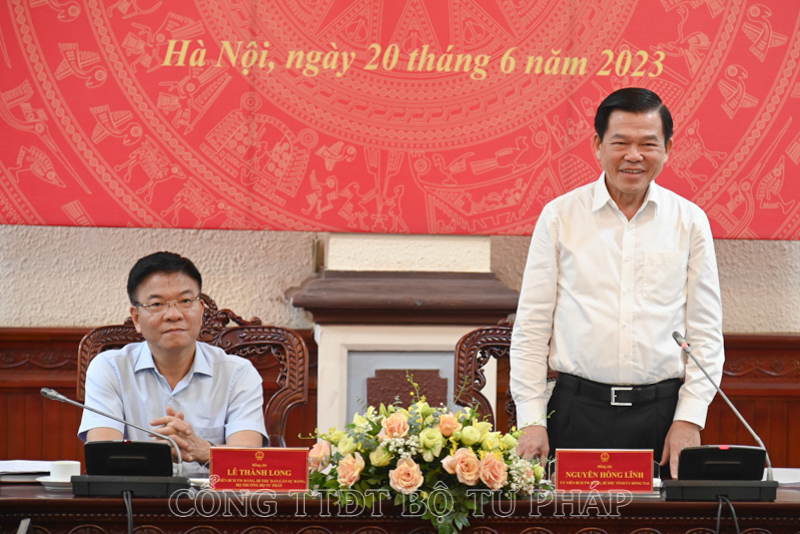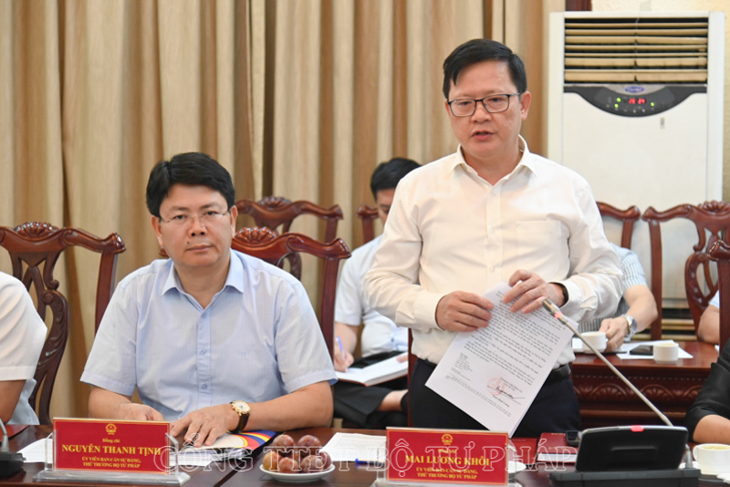 Đồng chí Lê Thành Long, Ủy viên Trung ương Đảng, Bí thư Ban Cán sự Đảng, Bộ trưởng Bộ Tư pháp phát biểu tại buổi làm việc