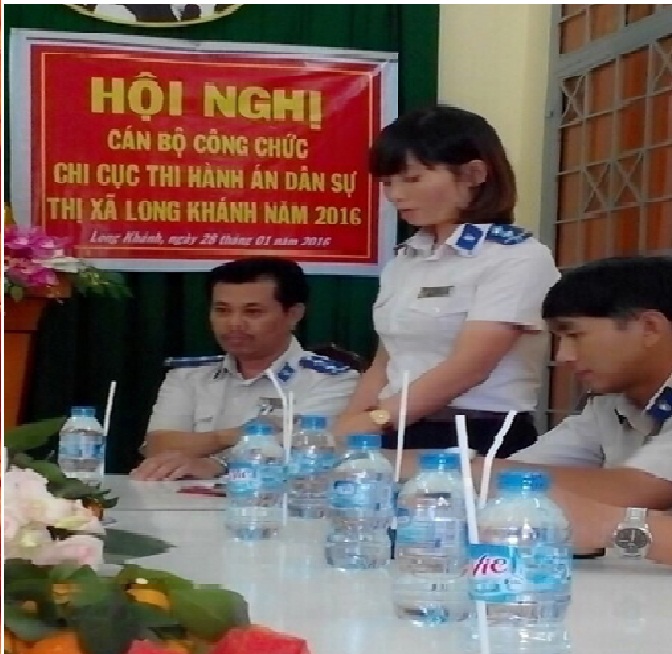 Ngày 22 tháng 01 năm 2016 tại Chi cục Thi hành án dân sự thị xã Long Khánh đồng chí Hoàng Minh Châu – Bí thư Chi bộ - Phụ trách Chi cục chủ trì buổi Lễ kết nạp Đảng viên đối với quần chúng Lê Trần Hà – Chuyên viên; tham dự buổi Lễ có đại diện Công đoàn, Đoàn thanh niên và toàn thể các đồng chí đảng viên trong Chi bộ. Lễ kết nạp Đảng viên được tổ chức trang nghiêm, đúng quy trình theo Hướng dẫn số 01- HD/TW ngày 05/01/2012 của Ban Bí thư khoá XI về một số vấn đề cụ thể thi hành Điều lệ Đảng.