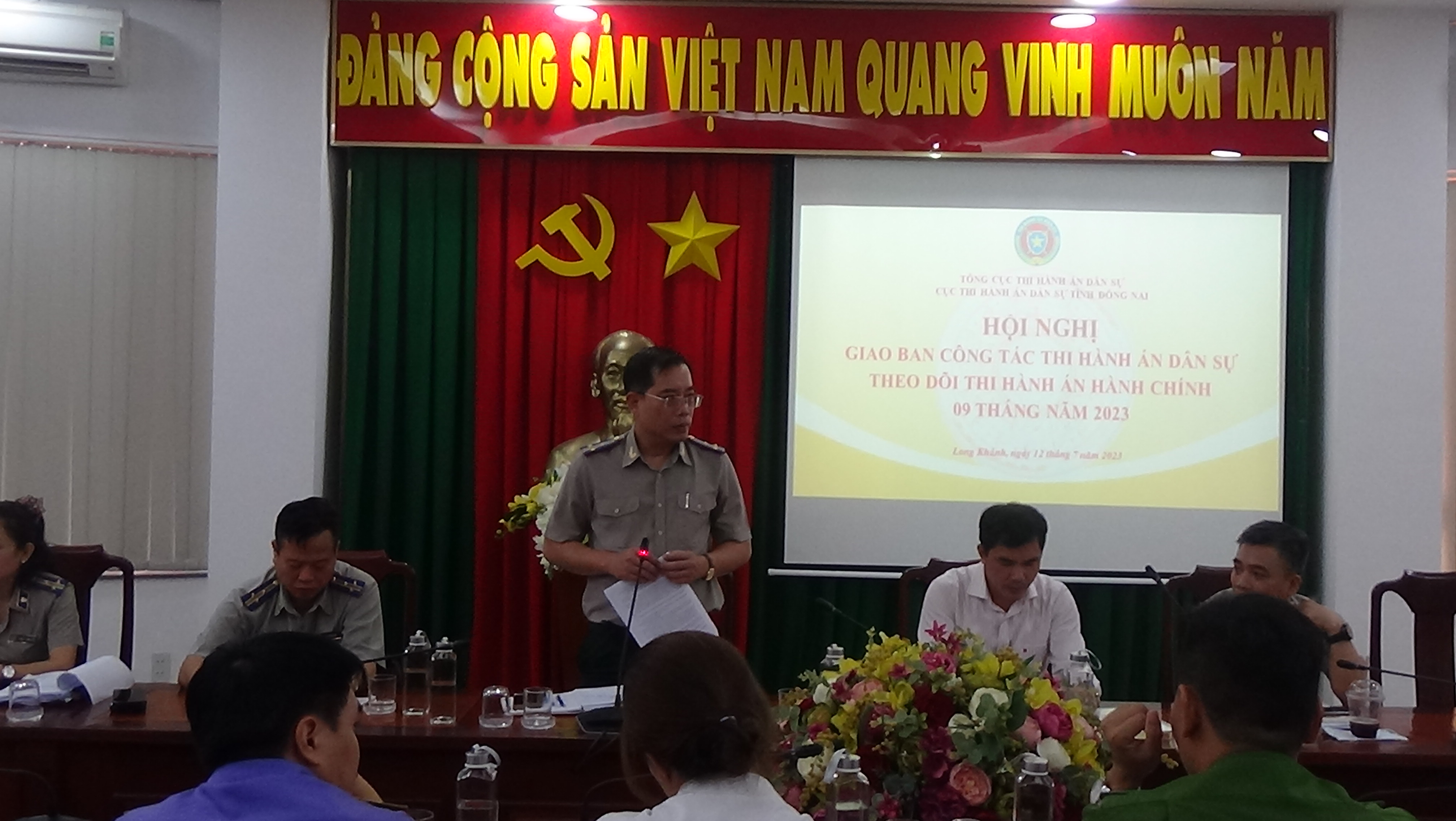 Phát biểu tại Hội nghị, Cục trưởng ghi nhận và biểu dương những kết quả đạt được trong 09 tháng đầu năm 2023, tuy nhiên bên cạnh đó vẫn còn những hạn chế tồn tại. Qua số liệu thống kê, báo cáo của Văn phòng Cục về kết quả thực hiện của Cục, kết quả của các Chi cục THADS các huyện, thành phố về việc toàn tỉnh đạt 70,47 %, về tiền đạt kết quả 38,03%. Tuy nhiên, Cục trưởng cũng thẳng thắn chỉ ra các tồn tại, hạn chế trong công tác THADS và các mặt công tác khác, kết quả thi hành án về về việc, về tiền của toàn tỉnh đạt thấp so với cùng kỳ năm 2022, kết quả THA đạt được của Chi cục THADS các huyện, thành phố thuộc tỉnh không đồng đều, công tác giải quyết khiếu nại, tố cáo còn một vài vụ việc phức tạp chưa xử lý xong, tiền trại giam chuyển về, tiền chi phí cưỡng chế, tiền chi phí tống đạt thừa phát lại, xác nhận công nợ với Trung tâm thẩm định giá, bán đấu đấu giá của Sở Tư pháp vẫn chưa thực hiện xong. Kết thúc Hội nghị đồng chí Cục trưởng yêu cầu các cơ quan THADS tỉnh Đồng Nai cần phải tập trung chỉ đạo và phấn đấu nhiều hơn nữa trong 03 tháng còn lại của năm 2023 để hoàn thành chỉ tiêu, nhiệm vụ được giao.