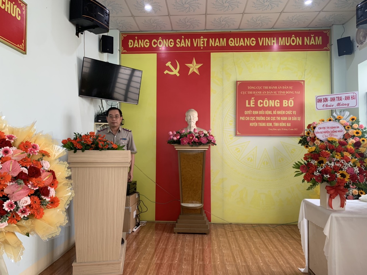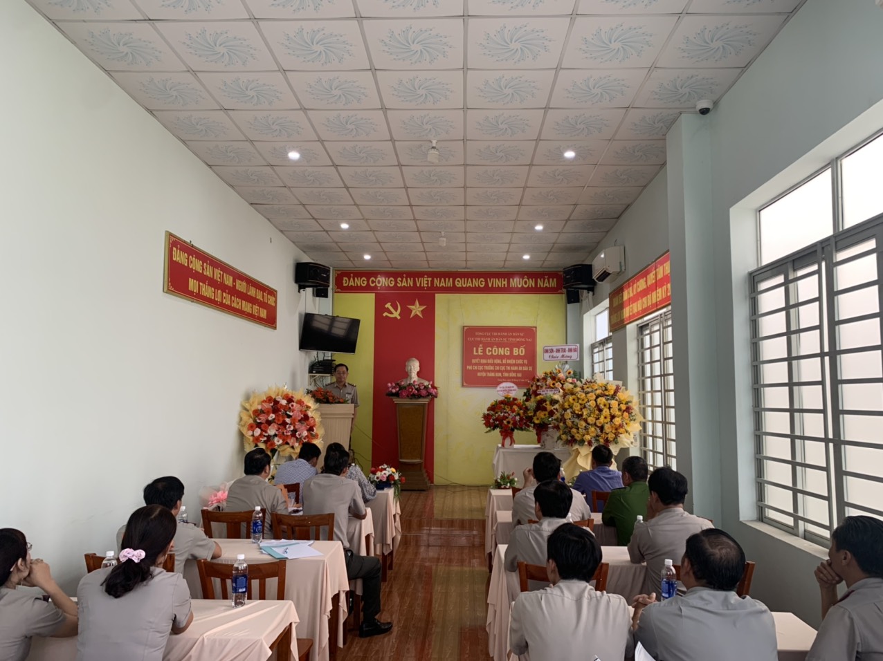 Tại buổi lễ, ông Trần Văn Thuần – Phó trưởng phòng, phụ trách Phòng Tổ chức cán bộ Cục THADS tỉnh đã công bố Quyết định số 855/QĐ-CTHADS ngày 22 tháng 12 năm 2022 của Cục THADS tỉnh Đồng Nai về việc điều đông, bổ nhiệm ông Nguyễn Đình Thành - Chấp hành viên trung cấp, Phó Chi cục trưởng Chi THADS huyện Vĩnh Cửu giữ chức vụ Phó Chi cục trưởng Chi cục THADS huyện Trảng Bom, thời gian bổ nhiệm là 05 năm, có hiệu lực kể từ ngày 01 tháng 01 năm 2023.