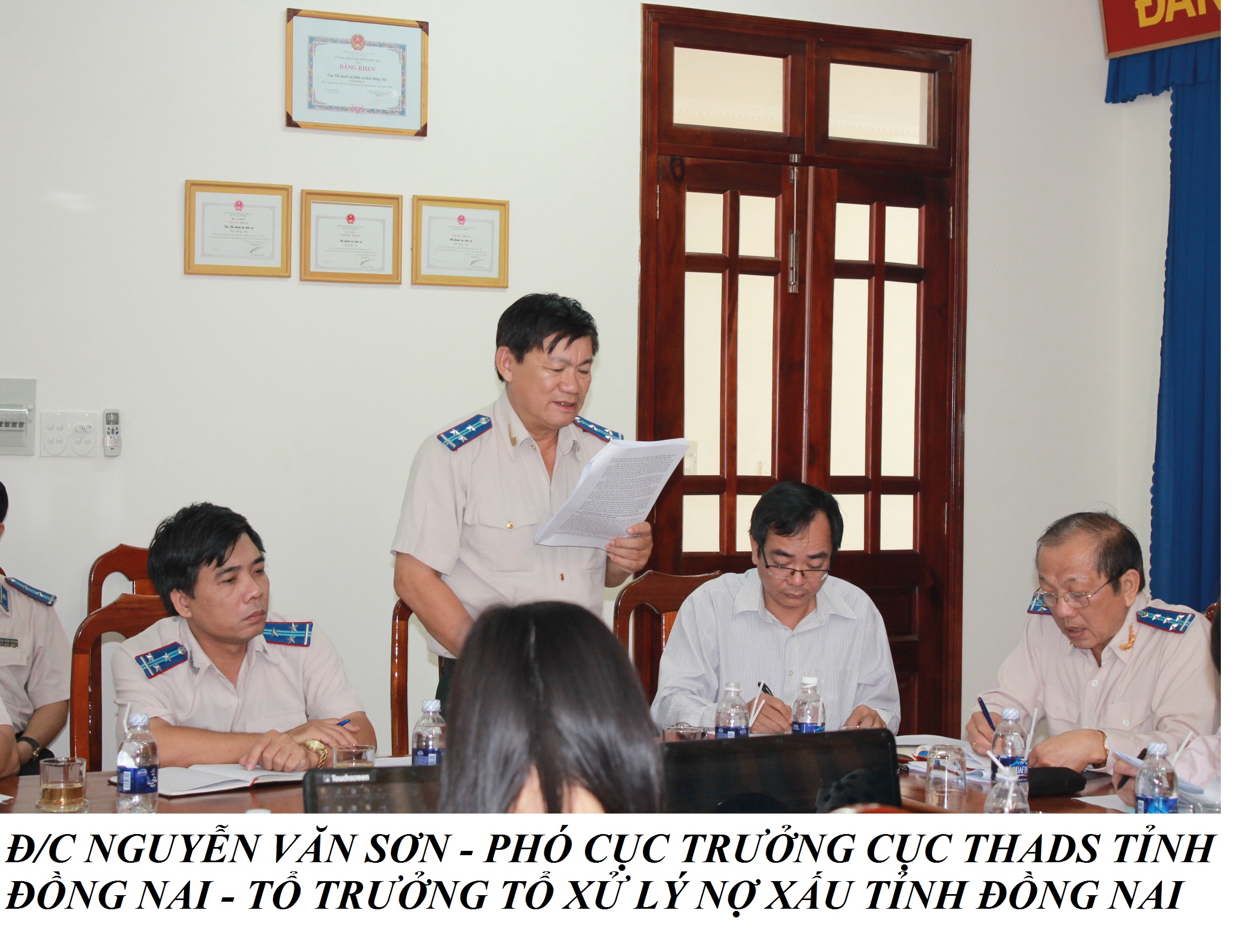 Trong ngày 05/01/2016, thực hiện chỉ đạo của Bộ trưởng Bộ Tư pháp tại Quyết định số 228/QĐ-BTP ngày 30/01/2015 về việc “Tập trung giải quyết các vụ việc thi hành án dân sự liên quan đến hoạt động tín dụng Ngân hàng”; triển khai thực hiện Quy chế phối hợp số 01/QCPH/NHNNVN-BTP ngày 15/01/2015 giữa Ngân hàng Nhà nước Việt Nam và Bộ Tư pháp, Tổng cục Thi hành án dân sự đã thành lập Đoàn công tác do đồng chí Nguyễn Văn Sơn - Phó Tổng cục trưởng, Tổ trưởng Tổ xử lý nợ xấu làm trưởng đoàn; đồng chí Lê Thị Kim Dung, Vụ trưởng Vụ Nghiệp vụ 1, Tổ phó Tổ xử lý nợ xấu và các đồng chí Thẩm tra viên, thành viên của Tổ công tác xử lý nợ xấu đã tiến hành làm việc với đồng chí Phan Văn Châu – Cục trưởng Cục Thi hành án dân sự tỉnh Đồng Nai - Phó trưởng ban chỉ đạo thi hành án dân sự; đồng chí Nguyễn Văn Sơn – Phó cục trưởng Cục Thi hành án dân sự tỉnh Đồng Nai – Tổ trưởng Tổ xử lý nợ xấu trên địa bàn tỉnh Đồng Nai; các Chi cục trưởng và Chấp hành viên trực tiếp tổ chức thi hành án; Đại diện Ngân hà...