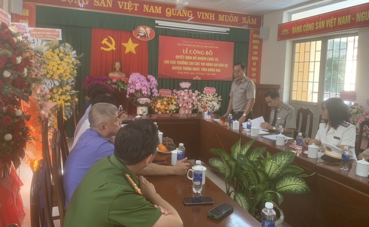 Tại buổi lễ, ông Trần Văn Thuần – Phó trưởng phòng, phụ trách Phòng Tổ chức cán bộ Cục THADS tỉnh đã công bố Quyết định số 840/QĐ-TCTHADS ngày 04 tháng 7 năm 2024 của Tổng cục trưởng Tổng cục THADS về việc bổ nhiệm bà Hồ Thị Vân Giang, Chấp hành viên trung cấp, Phó Chi cục trưởng Chi cục THADS huyện Thống Nhất, tỉnh Đồng Nai giữ chức vụ Chi cục trưởng Chi cục THADS huyện Thống Nhất, tỉnh Đồng Nai, thời gian bổ nhiệm là 05 năm, có hiệu lực kể từ ngày 10 tháng 7 năm 2024.