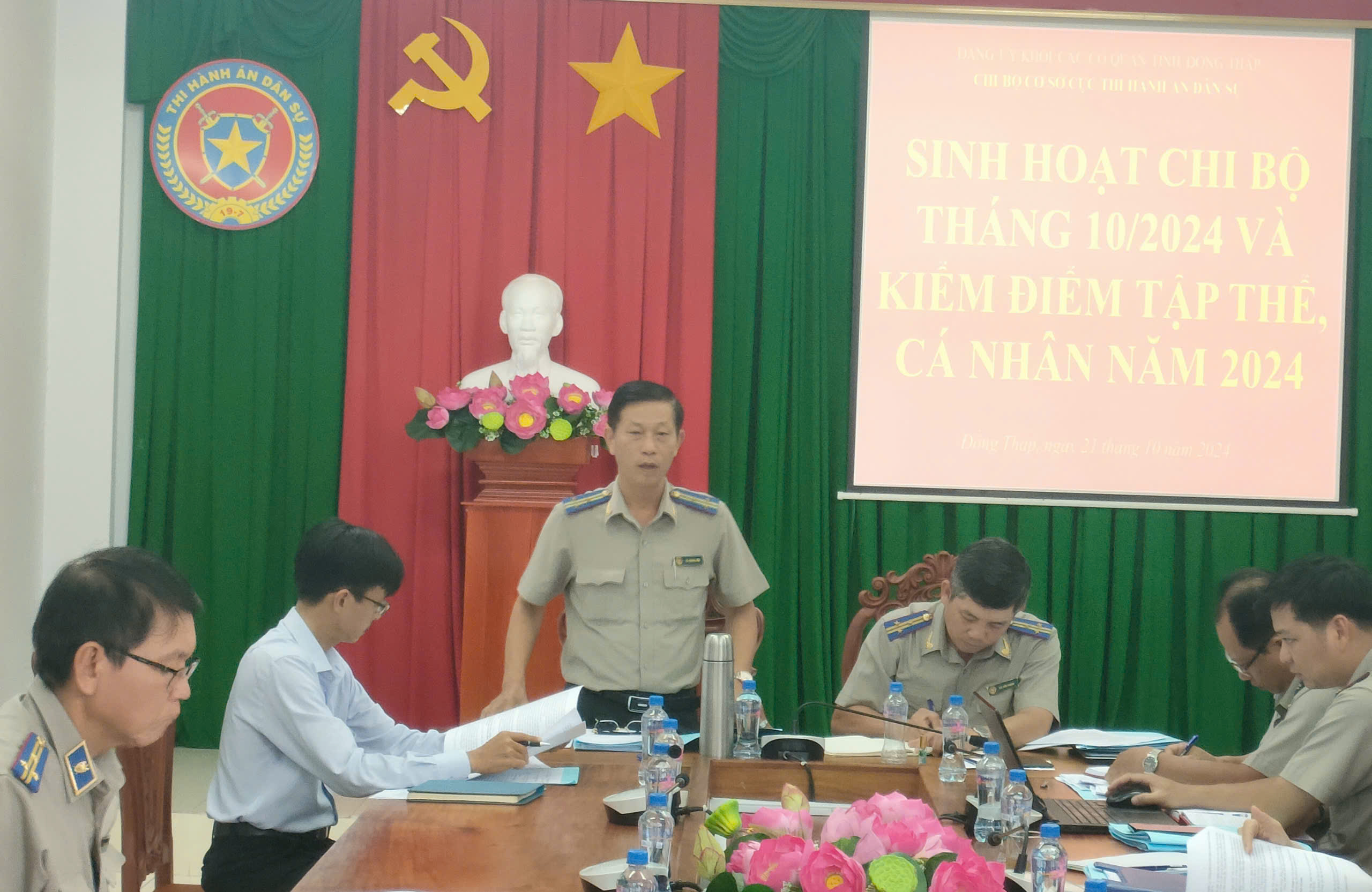 Căn cứ Kế hoạch số 266-KH/TU ngày 22/7/2024 của Ban Thường vụ Tỉnh ủy Đồng Tháp về việc kiểm điểm, đánh giá, xếp loại chất lượng hằng năm đối với tập thể, cá nhân trong hê thống chính trị từ Tỉnh đến cơ sở; Kế hoạch số 210-KH/ĐUK ngày 15/8/2024 của Ban Thường vụ Đảng ủy Khối các cơ quan Tỉnh về kiểm điểm, đánh giá, xếp loại chất lượng hằng năm đối với tổ chức đảng, đảng viên và tập thể, cá nhân cán bộ lãnh đạo, quản lý thuộc Khối. Chiều ngày 21/10/2024, Chi bộ cơ sở Cục Thi hành án dân sự đã tiến hành kiểm điểm, đánh giá, xếp loại chất lượng Chi bộ, đảng viên năm 2024.