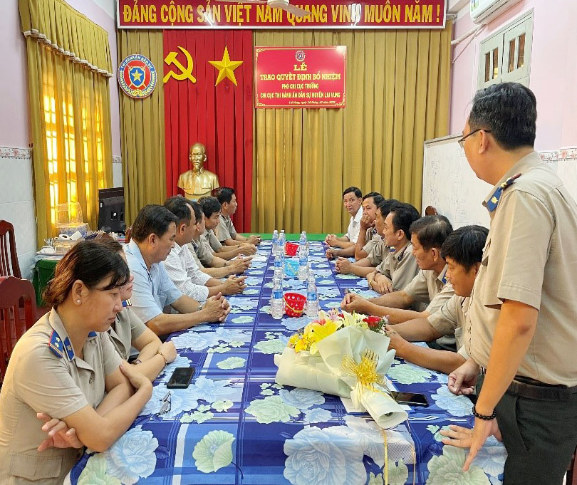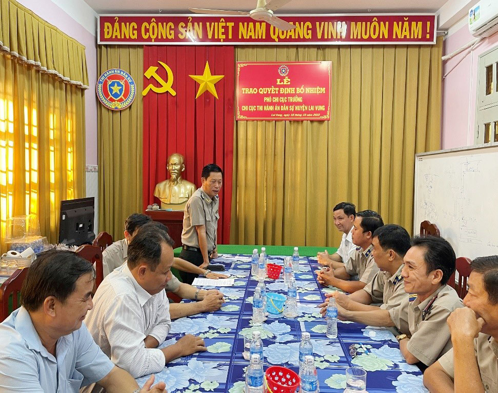 Chiều ngày 18/10/2022, tại Chi cục Thi hành án dân sự huyện Lai Vung, ông Vũ Quang Hiện – Cục trưởng Cục Thi hành án dân sự tỉnh Đồng Tháp chủ trì Lễ công bố và trao quyết định bổ nhiệm Phó Chi cục trưởng Chi cục Thi hành án dân sự huyện Lai Vung đối với ông Trương Quốc Trung.