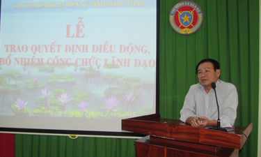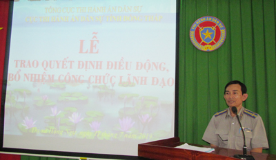 Phát biểu chỉ đạo - Cục trưởng Bùi Văn Tấn thay mặt Lãnh đạo Cục Thi hành án dân sự chúc mừng các công chức mới được điều động, bổ nhiệm. Cục trưởng nhấn mạnh, việc điều động, luân chuyển là công tác thường xuyên, liên tục theo chủ trương của Đảng, Nhà nước nhằm tạo điều kiện cho các công chức lãnh đạo nhận nhiệm vụ mới có điều kiện trau dồi nghiệp vụ công tác thông qua nhiều môi trường, tạo động lực thúc đẩy sự phát triển và lớn mạnh của đội ngũ lãnh đạo của các cơ quan Thi hành án dân sự tỉnh Đồng Tháp trong thời gian tới. Cục trưởng đề nghị các công chức mới được điều động, bổ nhiệm không ngừng nỗ lực phấn đấu, rèn luyện, trau dồi kiến thức nghiệp vụ và kỹ năng quản lý, đoàn kết nhất trí trong tập thể để hoàn thành xuất sắc nhiệm vụ được giao./.