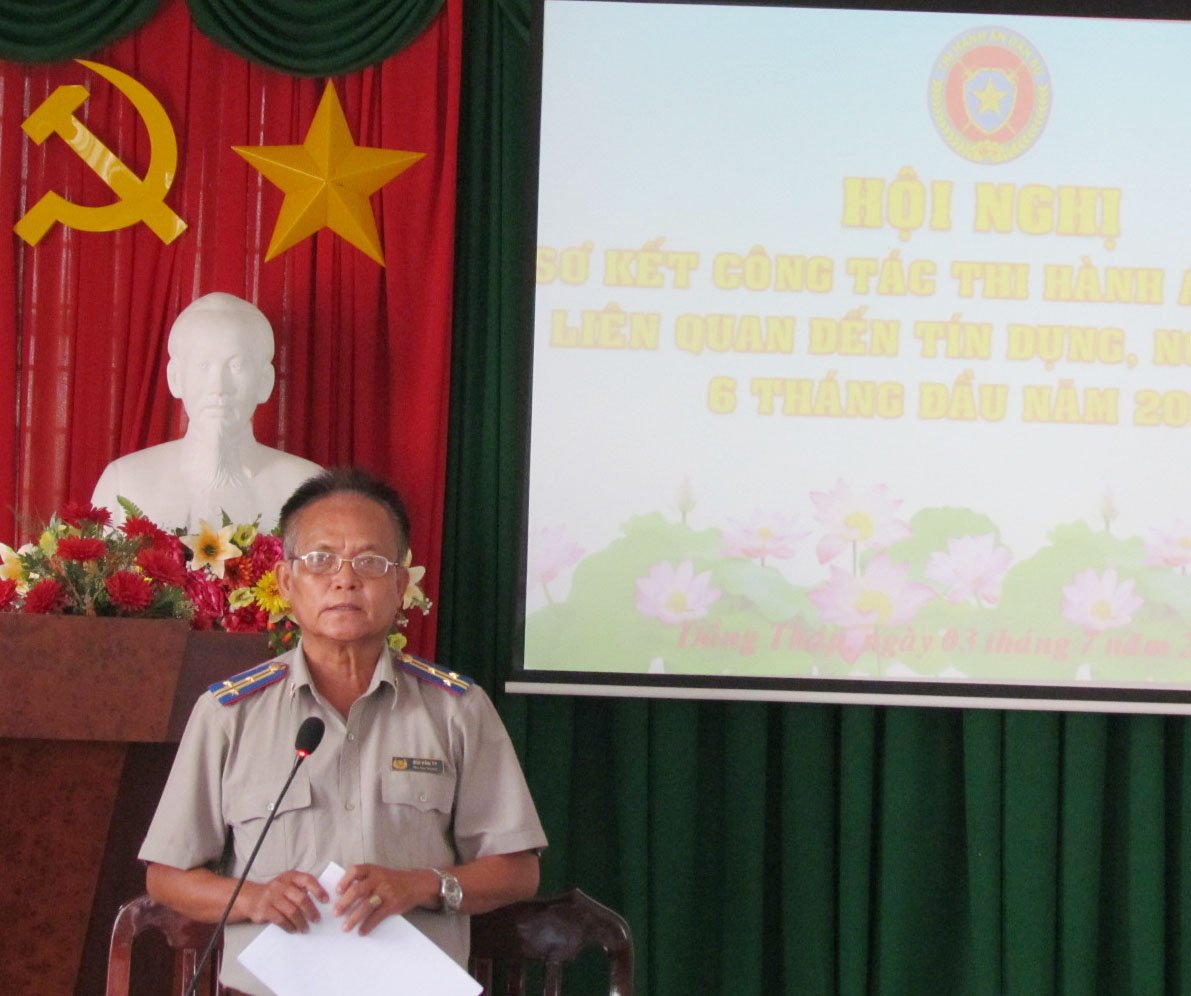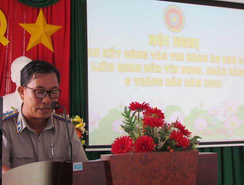Tại hội nghị, Trưởng phòng Nghiệp vụ và tổ chức THADS Phạm Văn Thanh - Thành viên Tổ chỉ đạo Thi hành án thông qua báo cáo sơ kết đánh giá kết quả thực hiện Quy chế phối hợp giữa Ngân hàng Nhà nước, chi nhánh tỉnh Đồng Tháp với Cục Thi hành án dân sự và Kế hoạch số 168/KH-THADS trong 6 tháng đầu năm 2018.