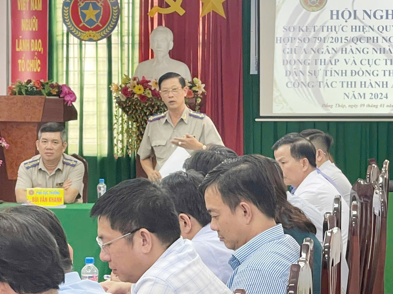 Chủ trì hội nghị có ông Vũ Quang Hiện, Cục trưởng Cục THADS tỉnh Đồng Tháp, thành phần tham dự Hội nghị, về phía Ngân hàng có bà Nguyễn Thị Kim Hân đại diện Ngân hàng nhà nước – chi nhánh tỉnh Đồng Tháp; về phía cơ quan THADS có lãnh đạo Cục, lãnh đạo Phòng Nghiệp vụ và tổ chức THADS, Phòng Kiểm tra giải quyết khiếu nại, tố cáo; Chi Cục trưởng THADS các huyện, thành phố; về phía các tổ chức tín dụng trên địa bàn Tỉnh gồm có Giám đốc, Trưởng phòng Tín dụng/Kinh doanh/Quan hệ khách hàng của các Chi nhánh ngân hàng trên địa bàn Tỉnh, ngoài ra còn có sự tham dự của đại diện các ngành liên quan như Viện kiểm sát nhân dân, Toà án nhân dân Tỉnh, Công an Tỉnh, Sở Tài nguyên và Môi trường, Văn phòng Đăng ký đất đai Tỉnh.