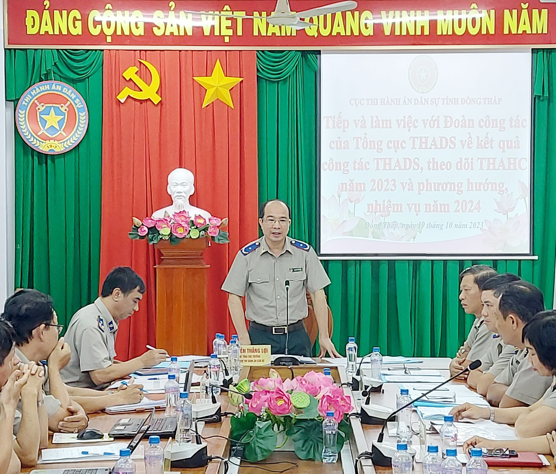 Ngày 19/10/2023, Phó Tổng cục trưởng Tổng cục Thi hành án dân sự (THADS) Nguyễn Thắng Lợi đã có buổi làm việc với tập thể Lãnh đạo Cục, Trưởng các phòng chuyên môn thuộc Cục THADS và 12 Chi cục trưởng Chi cục THADS huyện, thành phố tỉnh Đồng Tháp về kết quả thực hiện chỉ tiêu, nhiệm vụ công tác năm 2023. Sau khi nghe Cục trưởng Cục THADS tỉnh Đồng Tháp báo cáo; phát biểu trao đổi, thảo luận của các đồng chí tham dự cuộc họp, Phó Tổng cục trưởng Nguyễn Thắng Lợi đã có ý kiến: