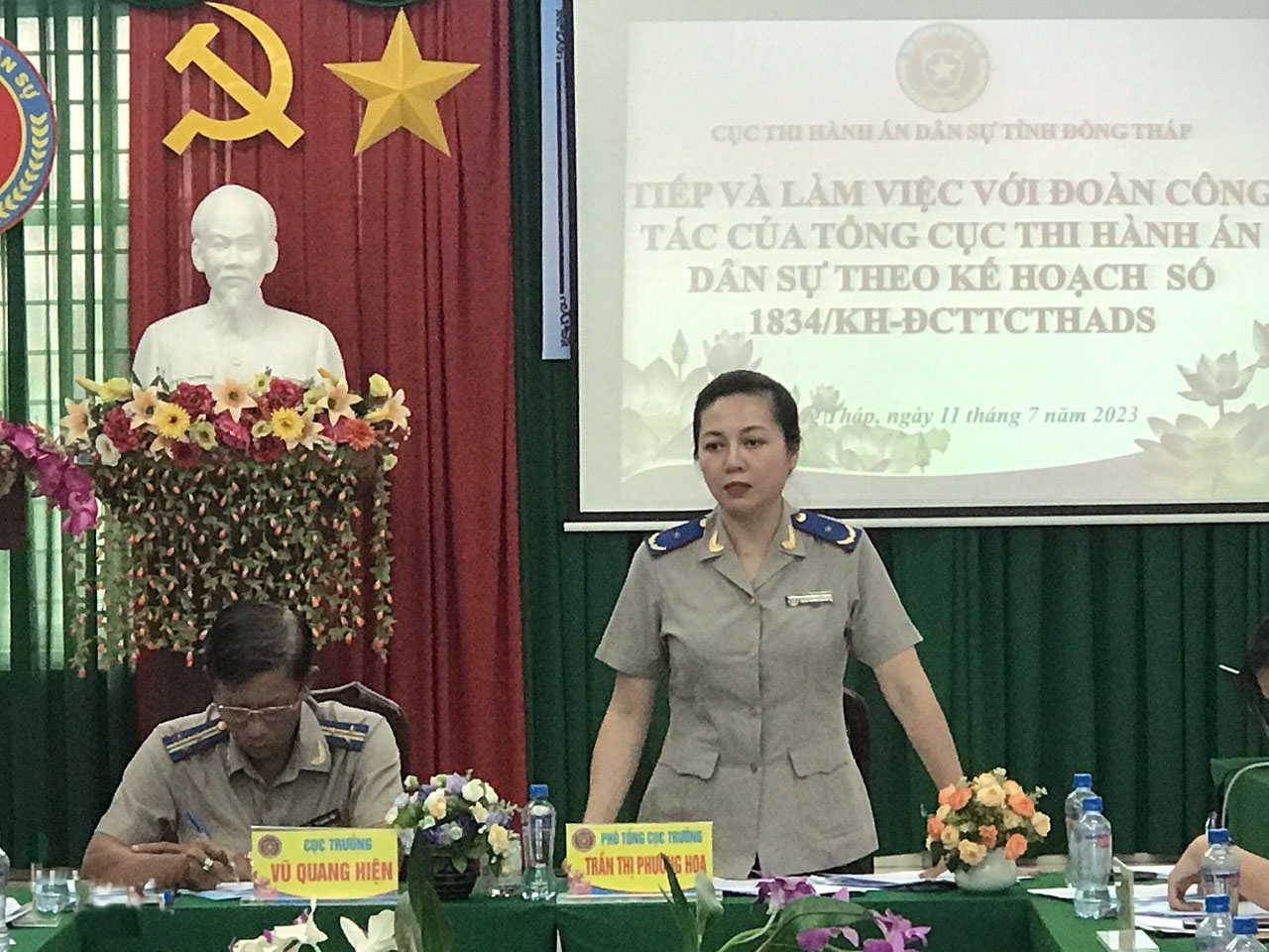 Thực hiện Quyết định số 537/QĐ-TCTHADS ngày 07/6/2023 của Tổng cục trưởng Tổng cục Thi hành án dân sự (THADS) về việc thành lập Đoàn công tác của Tổng cục THADS; Kế hoạch số 1834/KH-ĐCTTCTHADS ngày 07/6/2023 của Đoàn công tác Tổng cục THADS làm việc tại các cơ quan THADS trên địa bàn tỉnh Đồng Tháp, Trà Vinh, Sóc Trăng. Chiều ngày 11/7/2023, Phó Tổng cục trưởng Trần Thị Phương Hoa đã có buổi làm việc với Cục THADS tỉnh Đồng Tháp để thông qua sơ bộ kết quả làm việc của Đoàn công tác, đồng thời nhân dịp này Phó Tổng cục trưởng Trần Thị Phương Hoa tham dự buổi họp giao ban công tác THADS, theo dõi THAHC 9 tháng đầu năm 2023 cùng Cục THADS tỉnh Đồng Tháp. Tham dự buổi làm việc có sự tham dự của các thành viên Đoàn công tác, lãnh đạo Cục, lãnh đạo các Phòng chuyên môn thuộc Cục và Chi cục trưởng Chi cục THADS các huyện, thành phố trong tỉnh.