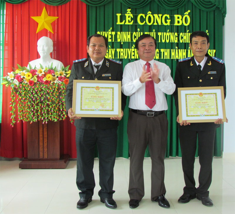 (Chủ tịch UBND tỉnh Phạm Thiện Nghĩa, trao Cờ thi đua Chính phủ cho đại diện Cục THADS)