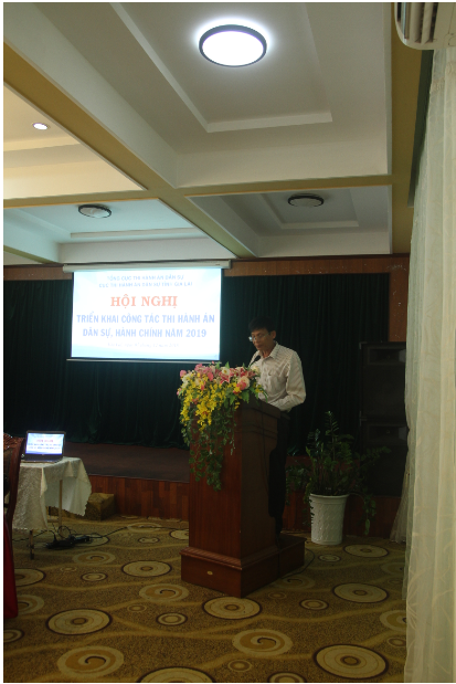 Tại Hội nghị đồng chí Nguyễn Đức Hoàng, Tỉnh ủy viên, Phó Chủ tịch UBND tỉnh-Trưởng Ban Chỉ đạo THADS tỉnh phát biểu chỉ đạo một số nhiệm vụ trọng tâm về THADS, hành chính năm 2019, đồng thời yêu cầu tập thể Lãnh đạo Cục THADS tỉnh, Lãnh đạo Chi cục THADS cấp huyện chủ động thường xuyên báo cáo Cấp ủy, chính quyền địa phương trong công tác THADS và tăng cường phối hợp các cơ quan chức năng của tỉnh, huyện về công tác THADS trên địa bàn; đẩy mạnh công tác đào tạo, bồi dưỡng, nâng cao trình độ, năng lực cho đội ngũ cán bộ công chức Hệ thống cơ quan THADS tỉnh Gia Lai, nhất là đội ngũ Chấp hành viên mạnh về chuyên môn nghiệp vụ, phẩm chất chính trị, đạo đức để đáp ứng yêu cầu nhiệm vụ do Đảng và Nhà nước giao phó, đồng thời tích cực thực hiện tốt chỉ tiêu, nhiệm vụ được giao hàng năm.