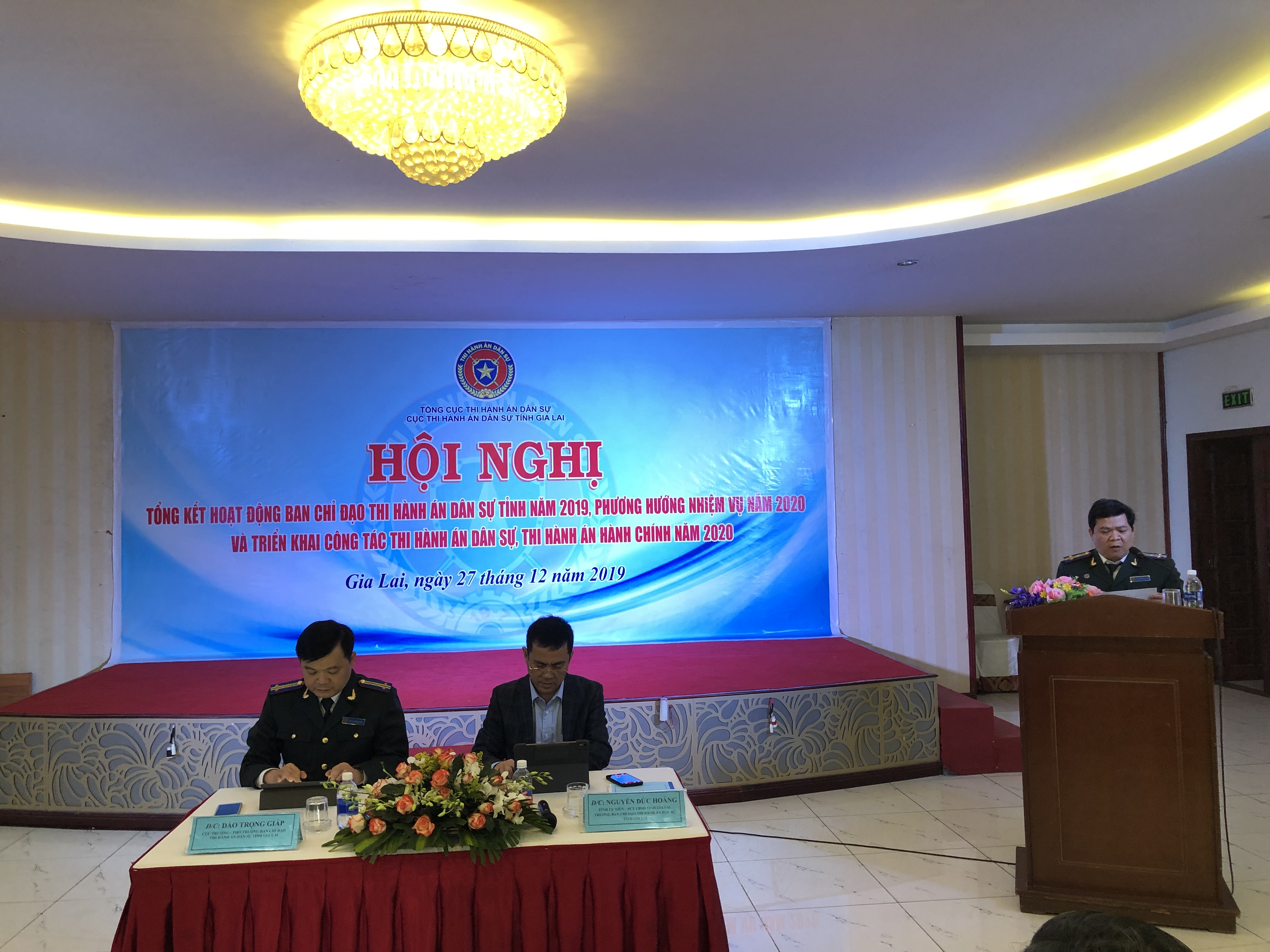 Ngày 27/12/2019, Cục Thi hành án dân sự tỉnh Gia Lai tổ chức Hội nghị tổng kết hoạt động Ban chỉ đạo Thi hành án dân sự, phương hướng nhiệm vụ năm 2020 và triển khai công tác thi hành án dân sự, theo dõi thi hành án hành chính năm 2020. Tham dự Hội nghị có đồng chí Nguyễn Đức Hoàng, Tỉnh ủy viên, Phó Chủ tịch UBND tỉnh, Trưởng Ban Chỉ đạo THADS tỉnh; Đại diện Lãnh đạo các Sở, ban ngành; Thành viên Ban Chỉ đạo Thi hành án dân sự tỉnh; Trưởng Ban chỉ đạo THADS cấp huyện cùng cán bộ, công chức, người lao động ngành Thi hành án dân sự tỉnh Gia Lai.