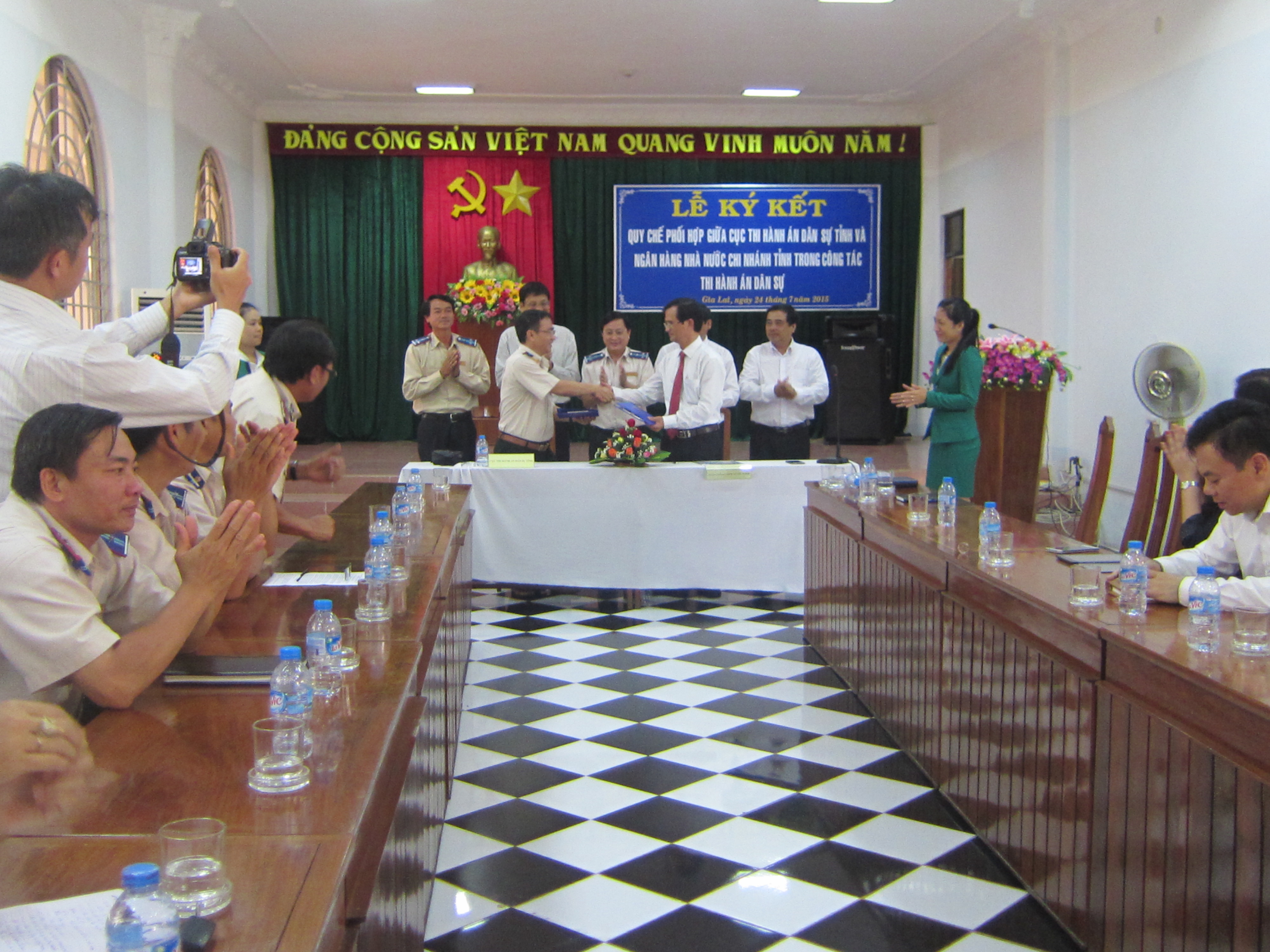Tham dự Lễ ký có đ/c Võ Văn Tuấn, Cục trưởng Cục THADS tỉnh, đ/c Nguyễn Văn Cư, Giám đốc Ngân hàng Nhà nước chi nhánh tỉnh Gia Lai; các Phó Cục trưởng, các Phó giám đốc Ngân hàng Nhà nước chi nhánh tỉnh Gia Lai cùng lãnh đạo phòng chuyên môn thuộc Cục, Chi cục trưởng Chi cục THADS các huyện, thị xã, thành phố và lãnh đạo Phòng chuyên môn thuộc Ngân hàng Nhà nước chi nhánh tỉnh, Giám đốc, Phó giám đốc chi nhánh các Ngân hàng thương mại trên địa bàn tỉnh Gia Lai.
