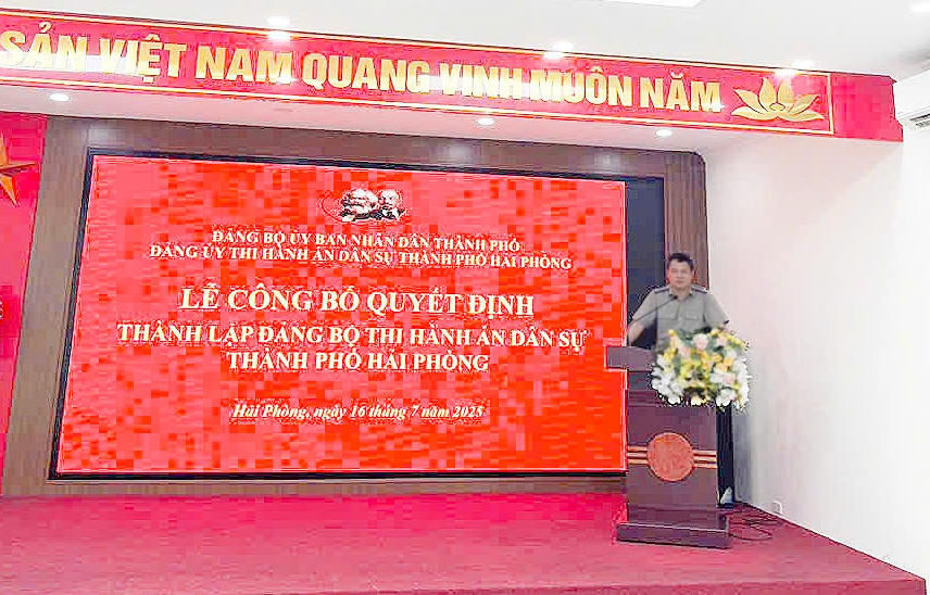 Ngày 16/7/2025, Đảng ủy Thi hành án dân sự thành phố Hải Phòng tổ chức Hội nghị công bố Quyết định thành lập Đảng bộ Thi hành án dân sự thành phố Hải Phòng; chỉ định Ban Chấp hành Đảng bộ, Ban Thường vụ, Bí thư, Phó bí thư Đảng ủy; Ủy ban Kiểm tra, Chủ nghiệm, Phó Chủ nhiệm ủy ban Kiểm tra Đảng ủy Thi hành án dân sự thành phố Hải Phòng, nhiệm kỳ 2025 – 2030.