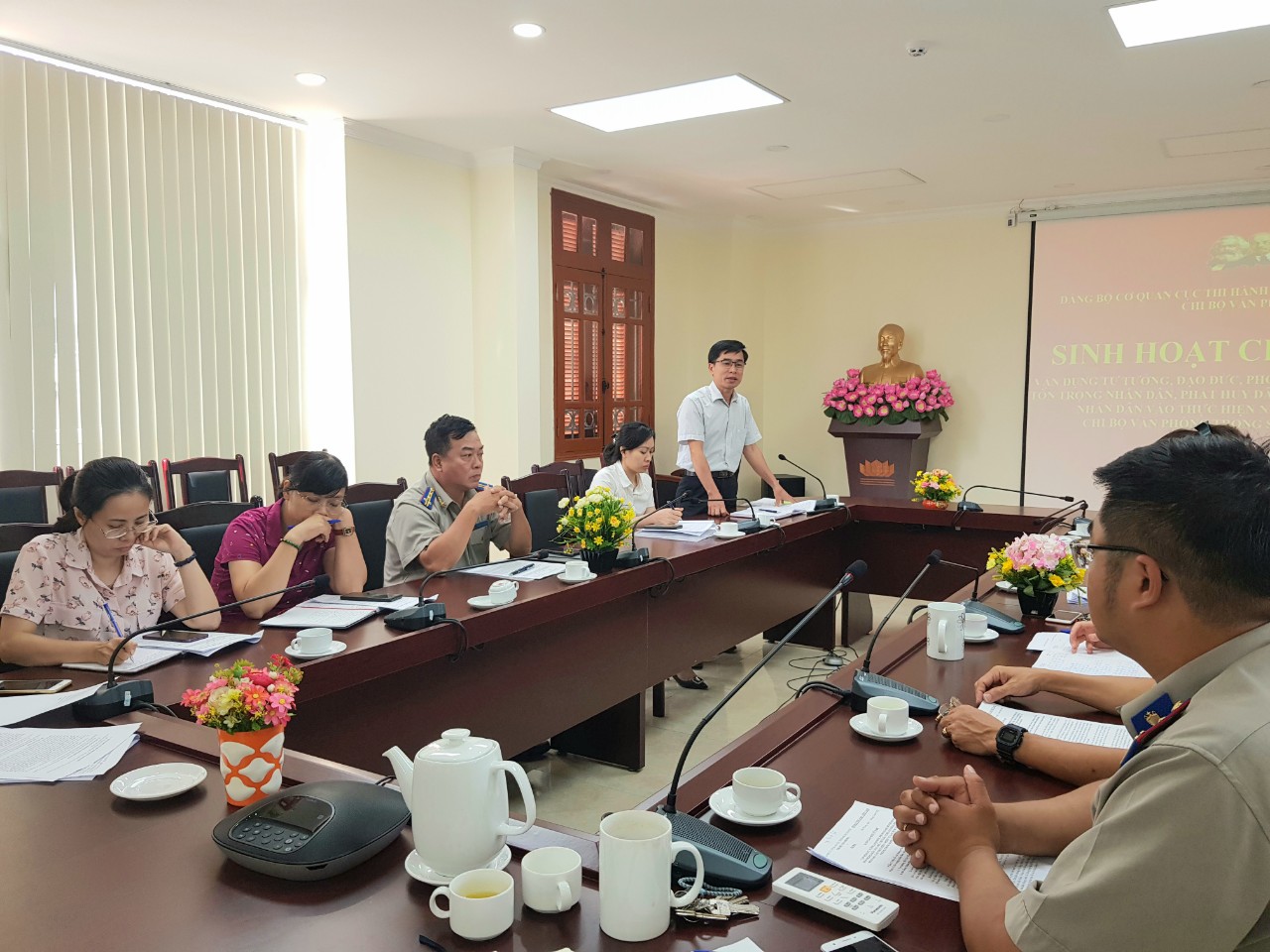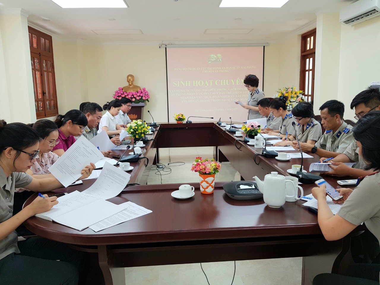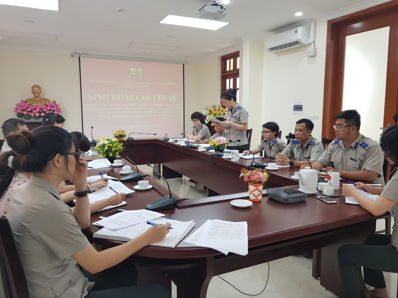 Ngày 23/6/2022, Chi bộ Văn phòng Cục Thi hành án dân sự thành phố tổ chức sinh hoạt chuyên đề về “Vận dụng tư tưởng, đạo đức, phong cách Hồ Chí Minh về tôn trọng nhân dân, phát huy dân chủ, chăm lo đời sống Nhân dân vào thực hiện nhiệm vụ xây dựng chi bộ Văn phòng trong sạch vững mạnh”. Tham dự buổi sinh hoạt có đồng chí Nguyễn Sinh Bảo - Ủy viên Ban Thường vụ, Chủ nhiệm Ủy ban kiểm tra Đảng ủy Khối các cơ quan thành phố, đồng chí Đỗ Thị Mai Anh - Chuyên viên Ban Tổ chức Đảng ủy Khối các cơ quan thành phố, đồng chí Phạm Tiến Binh - Phó Bí thư Đảng ủy, Phó Cục trưởng Cục Thi hành án dân sự thành phố, cùng toàn thể các đồng chí đảng viên trong Chi bộ.