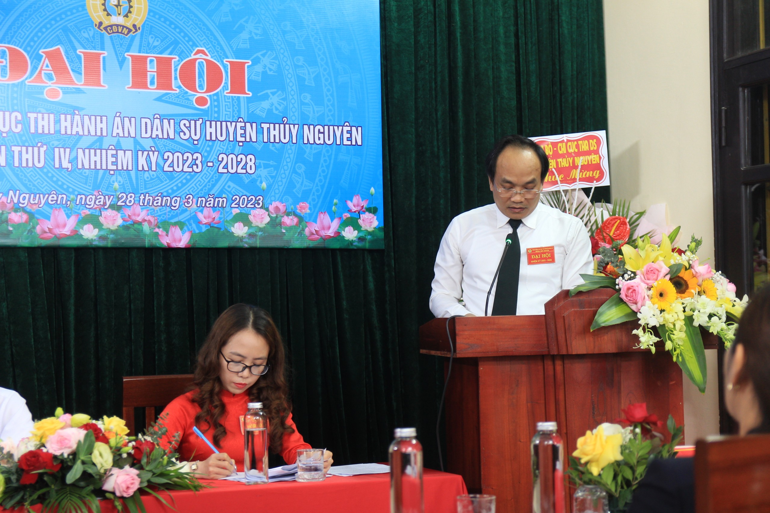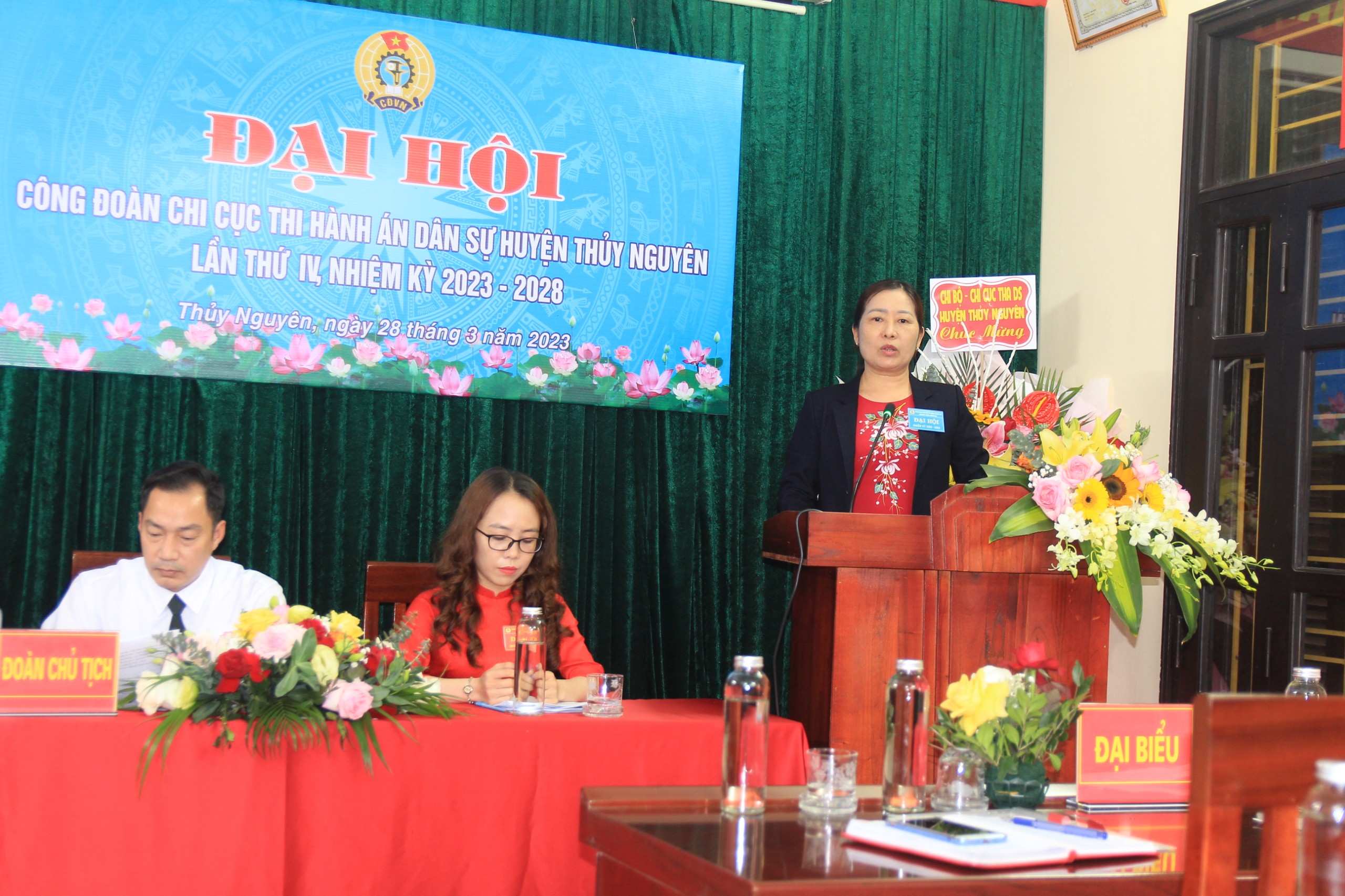 Thực hiện Thông tri số 11-TT/HU ngày 04/5/2022 của Ban Thường vụ Huyện uỷ về lãnh đạo Đại hội Công đoàn cơ sở tiến tới Đại hội Công đoàn huyện ần thứ XI và Kế hoạch số 18/KH-LĐLĐ ngày 18/5/2022 của Ban Thường vụ Liên đoàn Lao động huyện. Được sự đồng ý Thường trực Liên đoàn Lao động huyện và Chi uỷ, chiều ngày 28/3/2023, Công đoàn Chi cục Thi hành án dân sự huyện Thủy Nguyên đã tổ chức Đại hội lần thứ IV, nhiệm kỳ 2023 - 2028. Đại hội vinh dự được đón đồng chí Nguyễn Thị Lương, Phó Chủ tịch Thường trực LĐLĐ huyện và đồng chí Nguyễn Thế Mạnh, Bí thư Chi bộ đến dự và chỉ đạo Đại hội.
