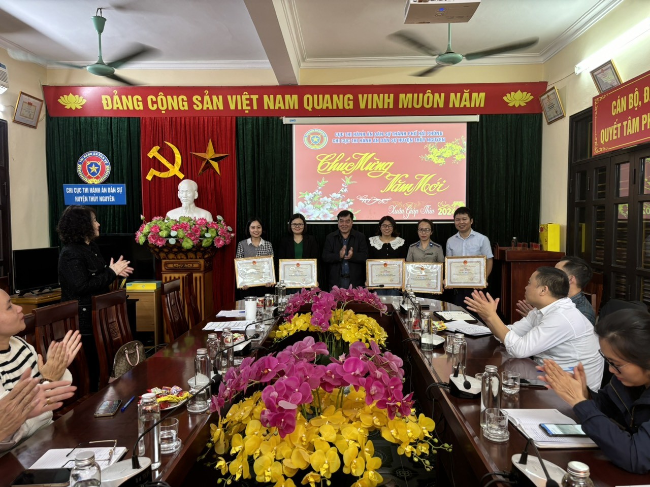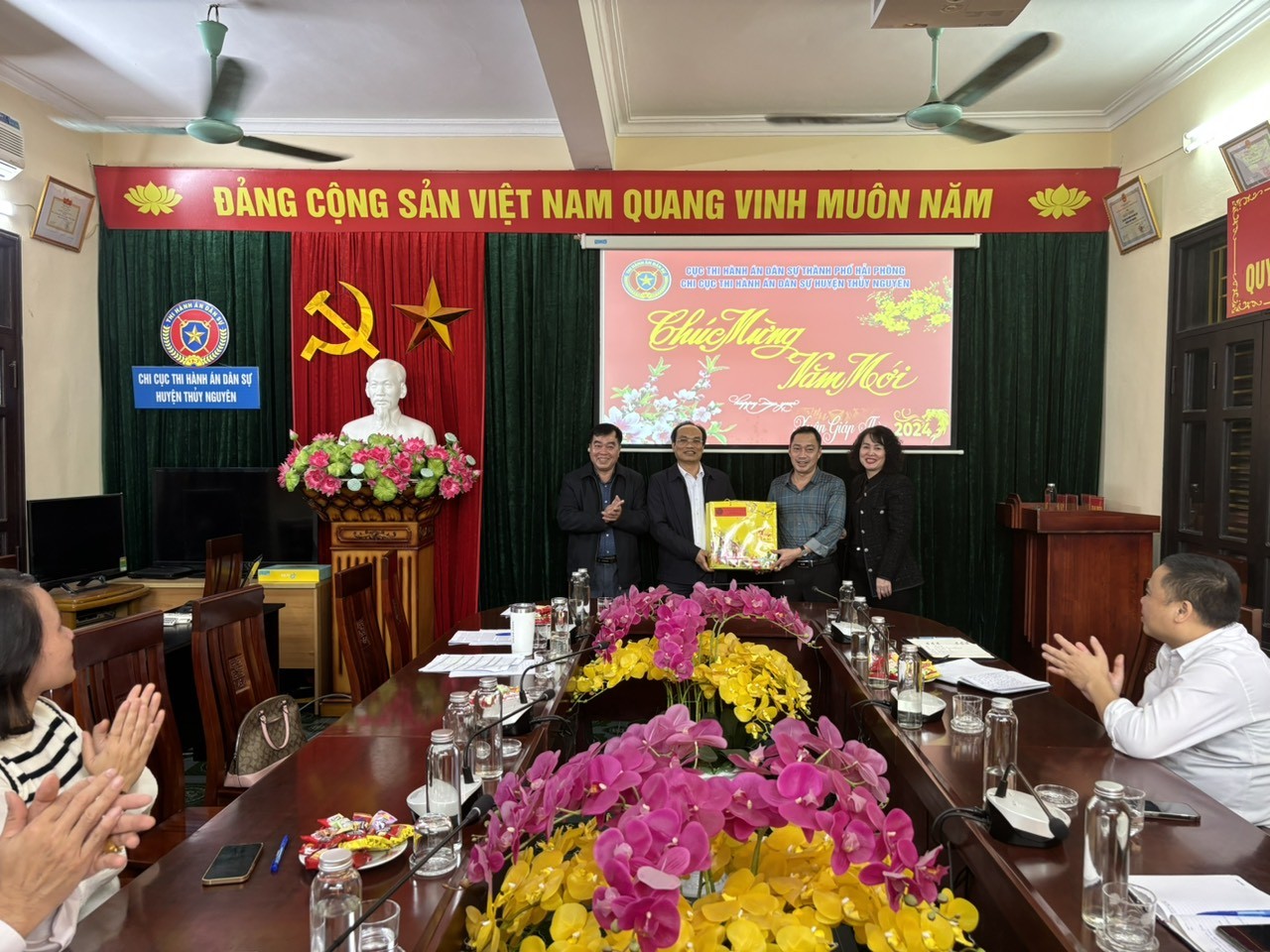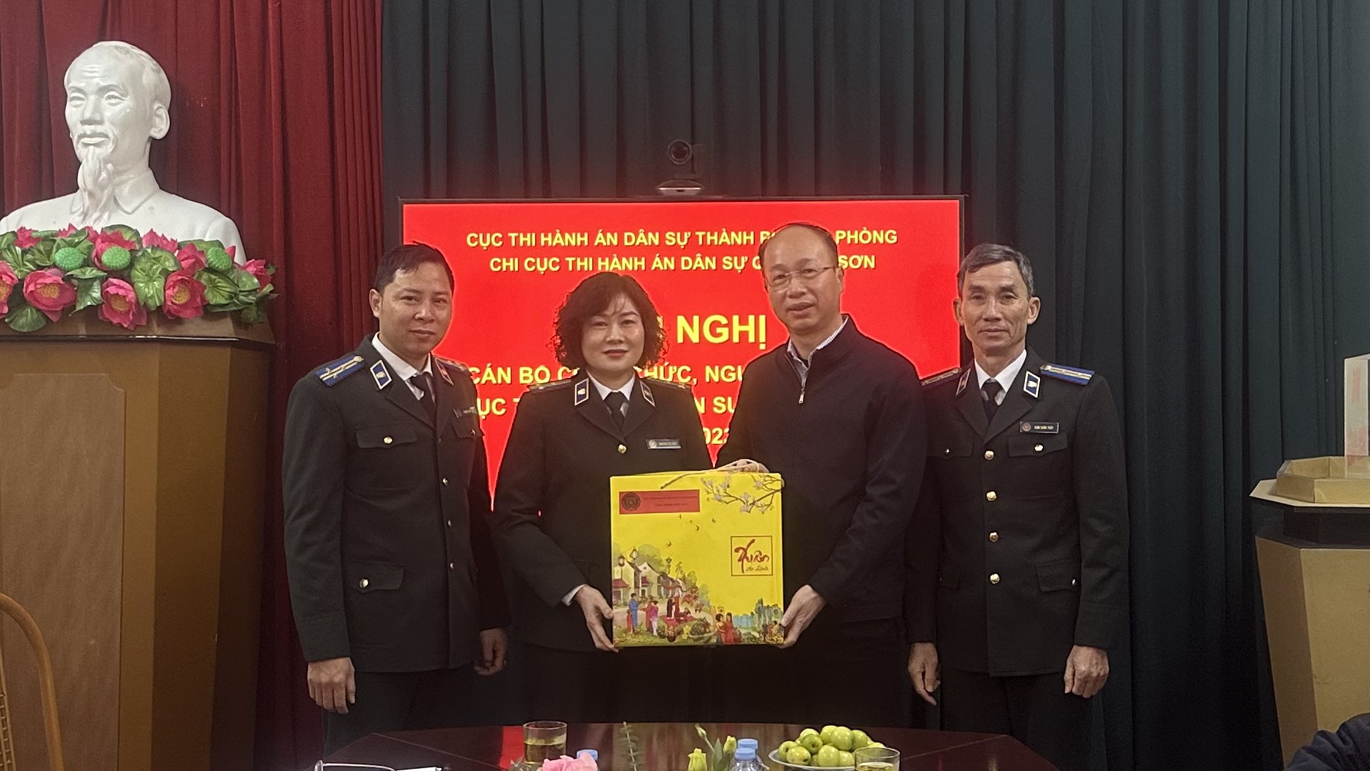 Nhân dịp chuẩn bị đón Tết Nguyên Đán Giáp Thìn năm 2024, Đồng chí Trần Hồng Quang- Cục trưởng và đồng chí Phạm Tiến Binh phó Cục trưởng cùng các đồng chí trưởng phòng chuyên môn làm việc tại các Chi cục Thi hành án dân sự quận, huyện và thực hiện công bố và trao tặng các hình thức khen thưởng năm 2023.