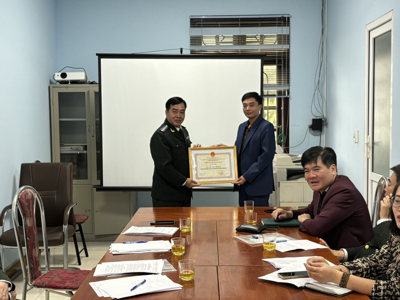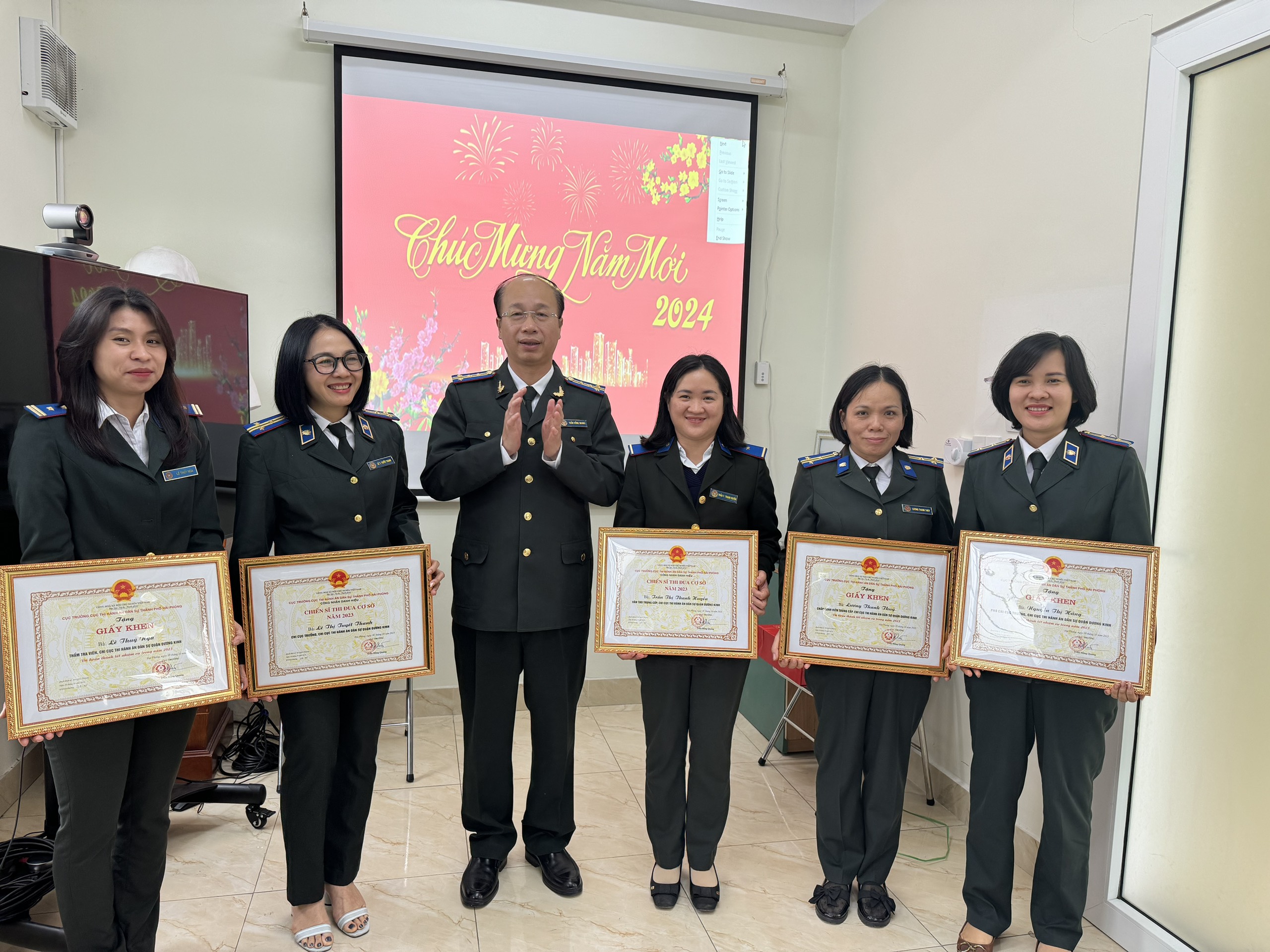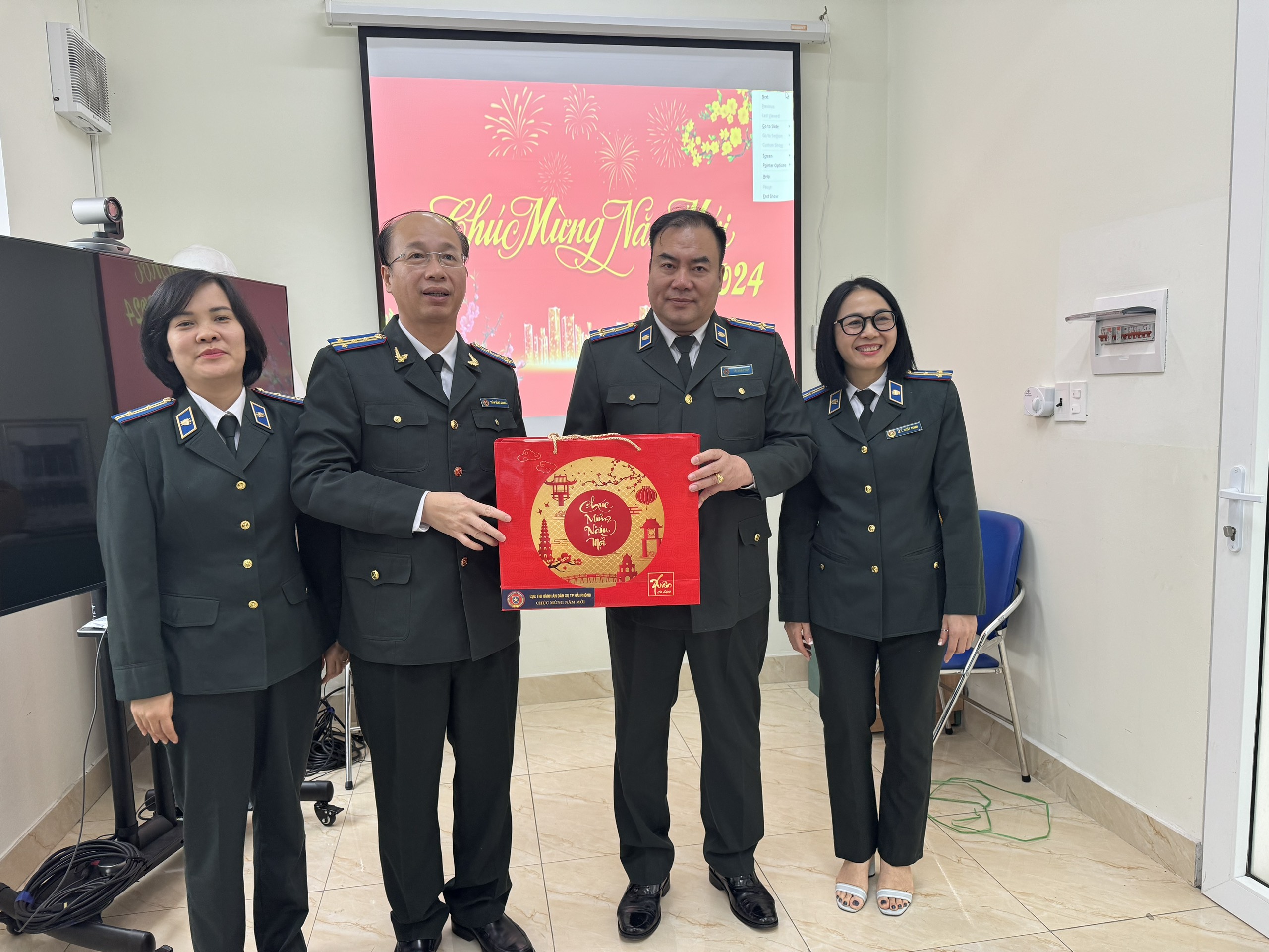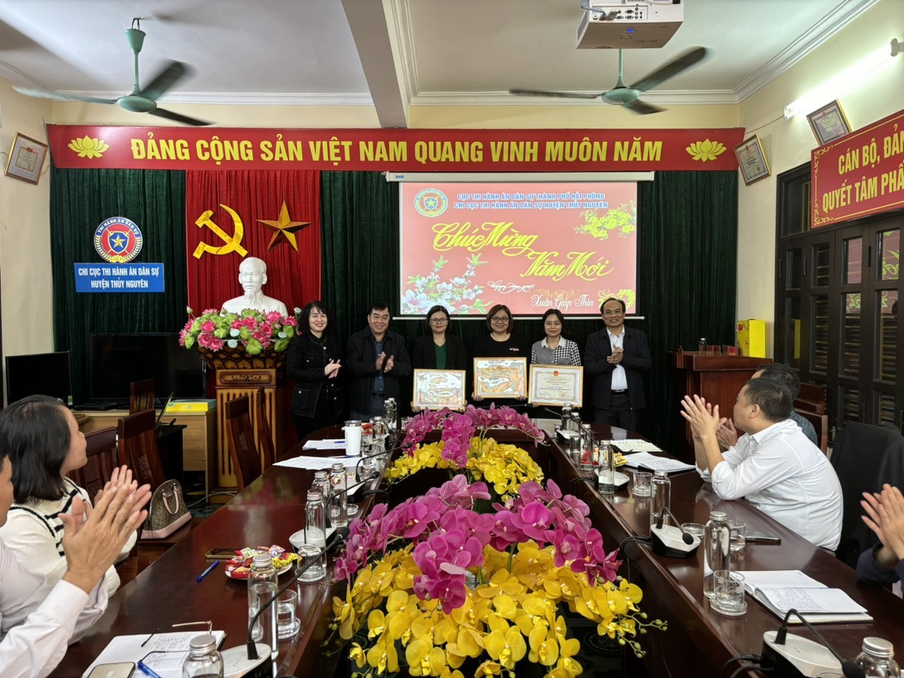 Nhân dịp chuẩn bị đón Tết Nguyên Đán Giáp Thìn năm 2024, Đồng chí Trần Hồng Quang- Cục trưởng và đồng chí Phạm Tiến Binh phó Cục trưởng cùng các đồng chí trưởng phòng chuyên môn làm việc tại các Chi cục Thi hành án dân sự quận, huyện và thực hiện công bố và trao tặng các hình thức khen thưởng năm 2023.